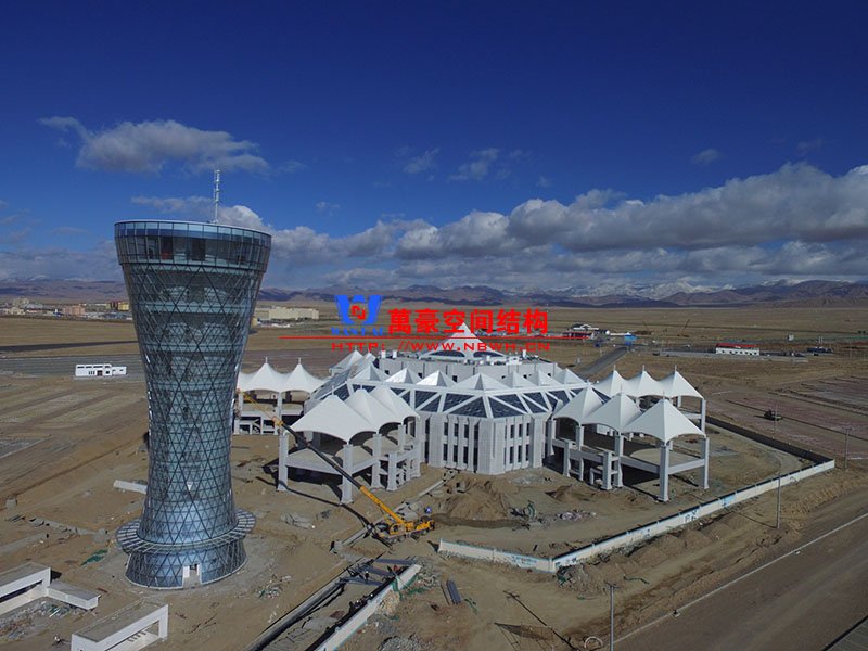 青海茶卡鹽湖天空之境集散中心鋼膜結(jié)構(gòu)項目位于擁有中國“天空之境”之稱的茶卡鹽湖。該項目分小蠻腰觀光塔和六角主樓兩部分,其中小蠻腰觀光塔由雙曲面空間鋼結(jié)構(gòu)相互交叉形成幾何形的外掛玻璃組成,主樓由雙曲面穹頂及6條連廊組成。鋼結(jié)構(gòu)跨度35米,鋼膜總面積28000平米,鋼結(jié)構(gòu)用鋼量1100噸。建筑內(nèi)部空間明亮通透,遠(yuǎn)觀猶如大漠孤煙中的鹽湖之晶,近觀仿佛置身于鹽湖中的浪漫滿屋。