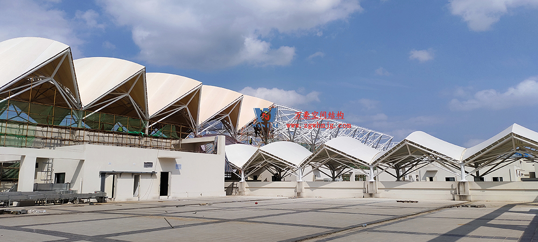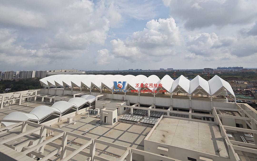 海南醫(yī)學(xué)院第一附屬醫(yī)院江東新院區(qū)膜結(jié)構(gòu)工程,該項(xiàng)目用鋼量約360噸,PTFE膜結(jié)構(gòu)展開(kāi)面積約4500平米。