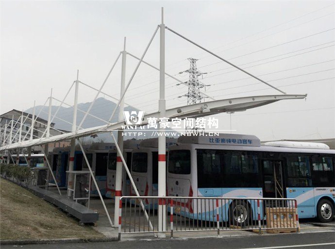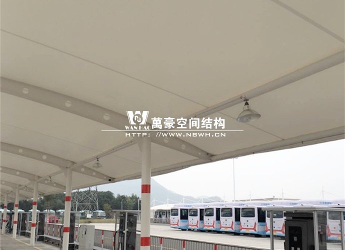 膜結(jié)構(gòu)雨棚施工面積約5138平方;用鋼量約80噸。施工難點(diǎn)在于工期緊。施工時(shí)天氣情況差,連續(xù)的陰雨天給鋼構(gòu)的油漆施工帶來了極大的麻煩并且延誤了工期。雨棚底下還要安裝充電樁,我們還要和充電樁施工班組進(jìn)行技術(shù)對接,規(guī)劃充電樁的安裝位置。由于工期緊,天氣狀況差,我們動用了兩個(gè)施工班組加班加點(diǎn),土建、鋼構(gòu)交叉施工,最后如期完工。由于每個(gè)雨棚長度比較長,施工班組在立好鋼構(gòu)件之后從中間開始往兩邊安裝膜布,使工作效率有了很大的提高。