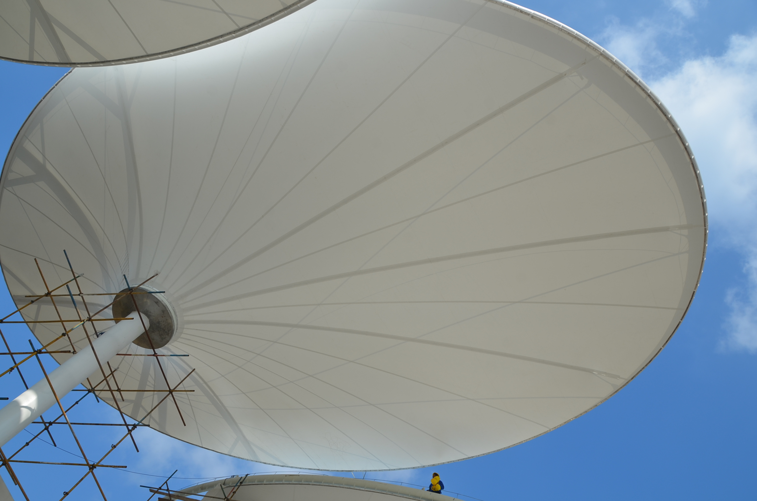 體育看臺膜結(jié)構(gòu)項目位于常州市延政西路與豐澤路交叉口 (常州大學西太湖校區(qū)體育場內(nèi))。該工程鋼結(jié)構(gòu)用量153噸、膜展開面積3500㎡,膜材采用進口法拉利膜材。目前鋼結(jié)構(gòu)部分已經(jīng)全部完成,鋼柱頂標高37米,由7個橢圓單體組成。橢圓長邊方向直徑29.8米,短邊方向直徑18.2米,每個橢圓單體鋼鉤重約22噸,鋼結(jié)構(gòu)鋼柱子內(nèi)灌滿混凝土