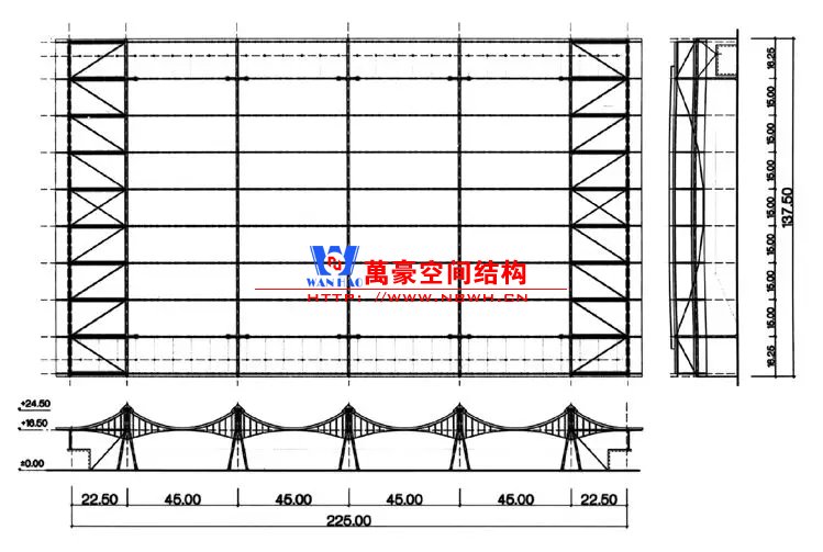 設(shè)計(jì)通過(guò)高40m、跨度95m的弧形膜結(jié)構(gòu)屋面和大面積玻璃幕墻突出了入口大廳的核心地位,并清晰高效地引導(dǎo)人流。十四個(gè)展廳分東西兩翼布局,西側(cè)布置了四個(gè)單層展廳,東側(cè)布置了五組兩層共十個(gè)展廳。這十四個(gè)展廳均采用了國(guó)內(nèi)會(huì)展公司常用的每個(gè)展廳10 000㎡的標(biāo)準(zhǔn)尺寸。展廳采用“方盒子”的設(shè)計(jì)理念和經(jīng)濟(jì)的結(jié)構(gòu)體系,用框架統(tǒng)一各展廳的語(yǔ)匯,并以清水混凝土呼應(yīng)入口大廳。從漢諾威會(huì)展中心數(shù)個(gè)展廳設(shè)計(jì)的發(fā)展中可以清晰地看到,目前的展廳設(shè)計(jì)遵從功能和商業(yè)價(jià)值至上。因此,必須嚴(yán)格符合高效嚴(yán)謹(jǐn)?shù)恼刮荒?shù),符合最佳吊點(diǎn)位置和高要求的吊掛荷載。而在這樣的條件下,漢諾威8/9號(hào)展廳的結(jié)構(gòu)體系已經(jīng)不再適用。青島紅島會(huì)展中心的展廳正是基于這種高效布展的方式進(jìn)行設(shè)計(jì)的:?jiǎn)螌踊螂p層的展廳采用了典型的方盒子形式,下層布置重展,上層布置輕展。下層采用鋼筋混凝土結(jié)構(gòu),最大跨度為24m,梁高2.0m,樓面荷載1.5t。屋蓋體系采用最為經(jīng)濟(jì)的桁架結(jié)構(gòu),跨度63m,桁架高度4.7m,用鋼量?jī)H為90kg/㎡。