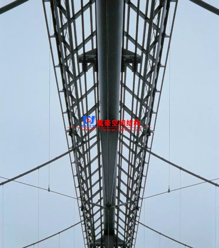 作為當(dāng)時(shí)世界上最大的展廳,8/9號(hào)廳在設(shè)計(jì)和施工工藝上也幾乎達(dá)到了當(dāng)時(shí)的技術(shù)極限。五榀138m長(zhǎng)的類似自錨式懸索橋的主桁架是整個(gè)展廳的主脊,由主纜、背索、水平連接桿及吊索組成,并支承在兩端的A形柱上。主桁架之間設(shè)置了鋼板懸?guī)菝?,和傳統(tǒng)的懸?guī)菝娌煌瑸榱吮苊饧哟笾麒旒艿呢?fù)擔(dān),結(jié)構(gòu)工程師沒(méi)有采用加重屋面板的傳統(tǒng)做法,而是在屋面下方加設(shè)穩(wěn)定索,形成豎向剛度較高的索桁架來(lái)抵抗風(fēng)荷載產(chǎn)生的上吸力和不均勻力。設(shè)計(jì)中充分利用懸掛體系,設(shè)置了包括兩個(gè)懸挑跨在內(nèi)的六跨結(jié)構(gòu)體系,在邊跨設(shè)置水平轉(zhuǎn)換桁架和斜拉索用于錨固。