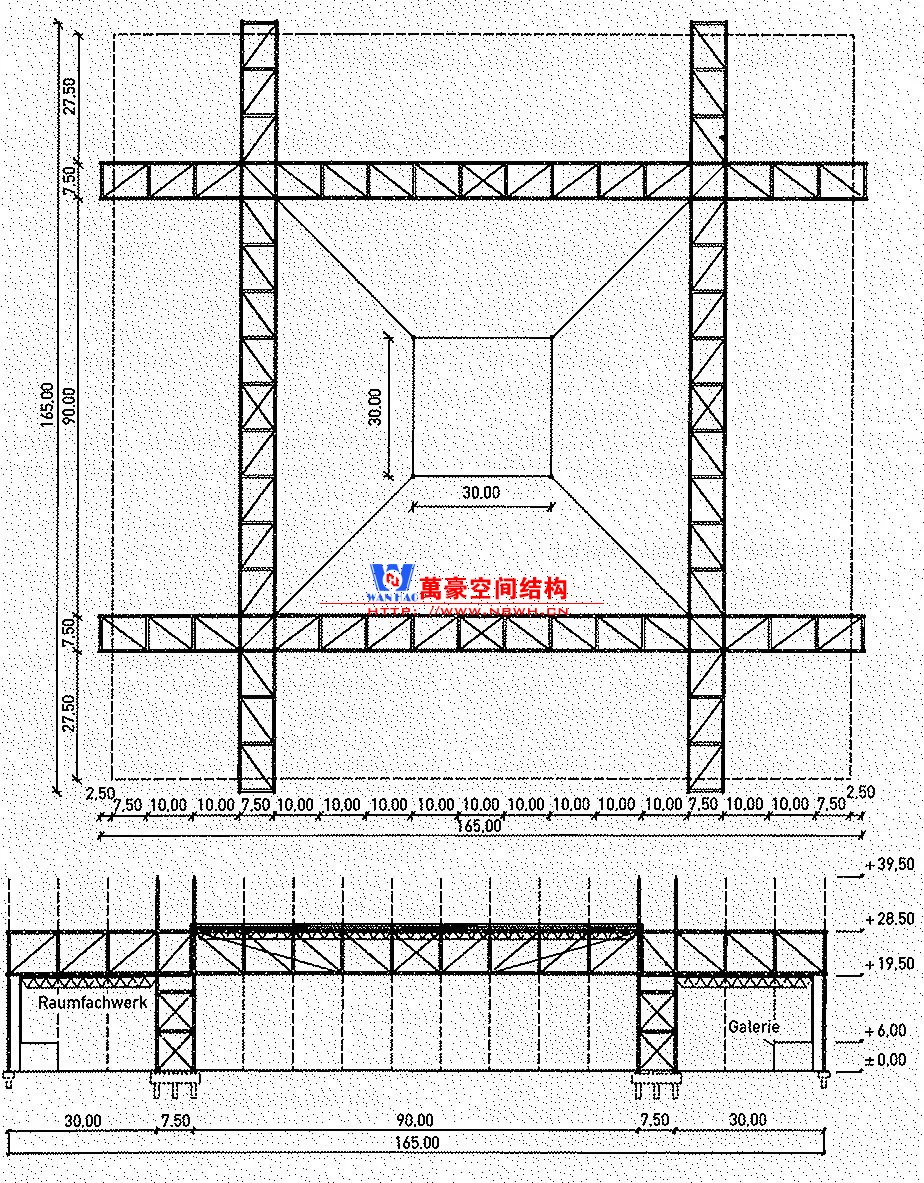 設(shè)計(jì)中采用了巨型結(jié)構(gòu)內(nèi)嵌子結(jié)構(gòu)的模數(shù)化方式。平面布置為十字形的矩形桁架支承在四個(gè)桁架核心筒上,結(jié)合中間設(shè)置的巨型下張弦體系將屋蓋體系分成了若干個(gè)最大跨度為30m的區(qū)域,而30m的跨度正好是當(dāng)時(shí)流行的網(wǎng)架結(jié)構(gòu)的經(jīng)濟(jì)跨度。結(jié)構(gòu)工程師巧妙地結(jié)合了使用功能,與建筑師一起創(chuàng)造出了這個(gè)看似理所當(dāng)然、實(shí)則內(nèi)有乾坤的體系。