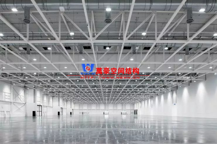 4號(hào)展廳的屋蓋采用了跨度122m、高度為9m的張弦桁架結(jié)構(gòu),并支承于兩側(cè)三層高的鋼筋混凝土結(jié)構(gòu)墻體上。富有秩序的結(jié)構(gòu)桿件有效地劃分了這個(gè)巨大的無(wú)柱空間。上弦是兩根直徑為500mm的熱軋無(wú)縫鋼管,下弦是兩根直徑為75mm的全封閉鋼絞線,與兩端鉸接的直腹桿和交叉索斜腹桿共同組成了索桁架體系。比起傳統(tǒng)的張弦梁,其上弦所受的彎矩很小,從而可以采用更纖細(xì)的截面,獲得結(jié)構(gòu)的輕盈感和良好的經(jīng)濟(jì)性。