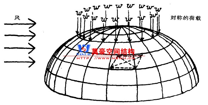 網(wǎng)殼受力方式為薄膜作用,屬于拱結構向三維的拓展;因此,與拱類似的問題會出現(xiàn)在網(wǎng)殼上。比如:整體穩(wěn)定問題;不對稱荷載敏感等。