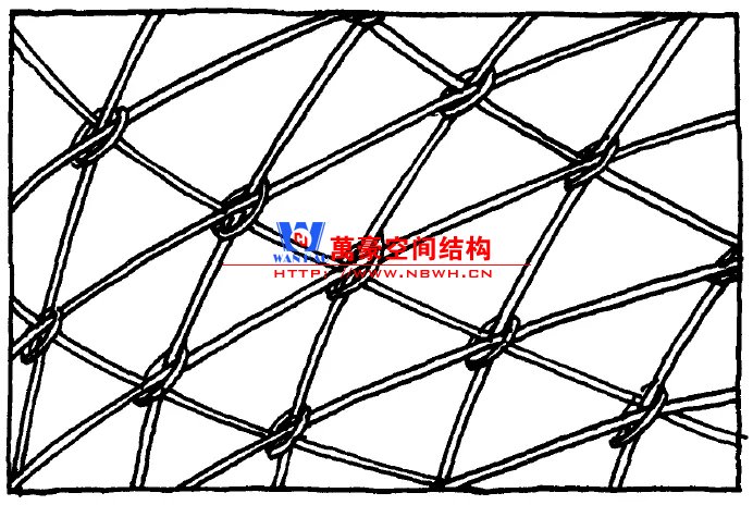 施萊希采用了四邊形網(wǎng)格劃分的球殼。網(wǎng)格桿件承擔軸力,增設拉索拉結對角節(jié)點,保證四邊形網(wǎng)格的穩(wěn)定性。