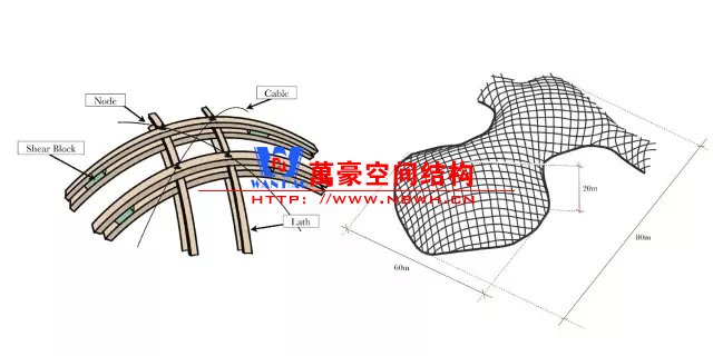最終形態(tài)與初始形態(tài)相比,原來的正方形網(wǎng)格轉變?yōu)榱庑?。同時,單根5cmx5cm木條剛度很小,允許發(fā)生足夠大的彎曲變形。在達到設計形狀后,需要修整外殼的邊緣;并且在菱形網(wǎng)格中增設交叉拉索,使柔軟的網(wǎng)格成為堅固的結構。