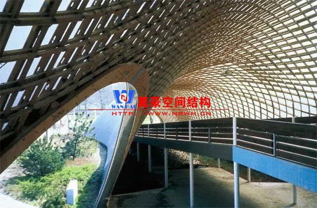 2000年,奧托和與坂茂合作了漢諾威世博會日本館,采用了與曼海姆大廳類似的網(wǎng)殼結構,只是屋面網(wǎng)格的木材換成了紙卷。