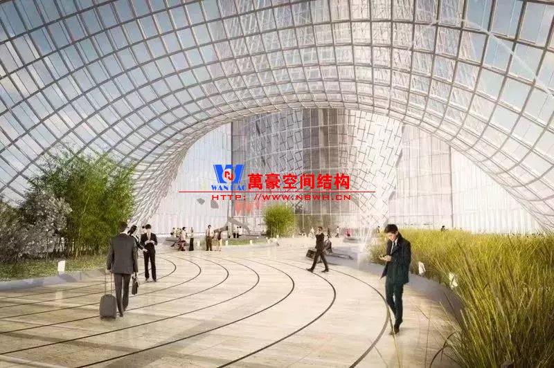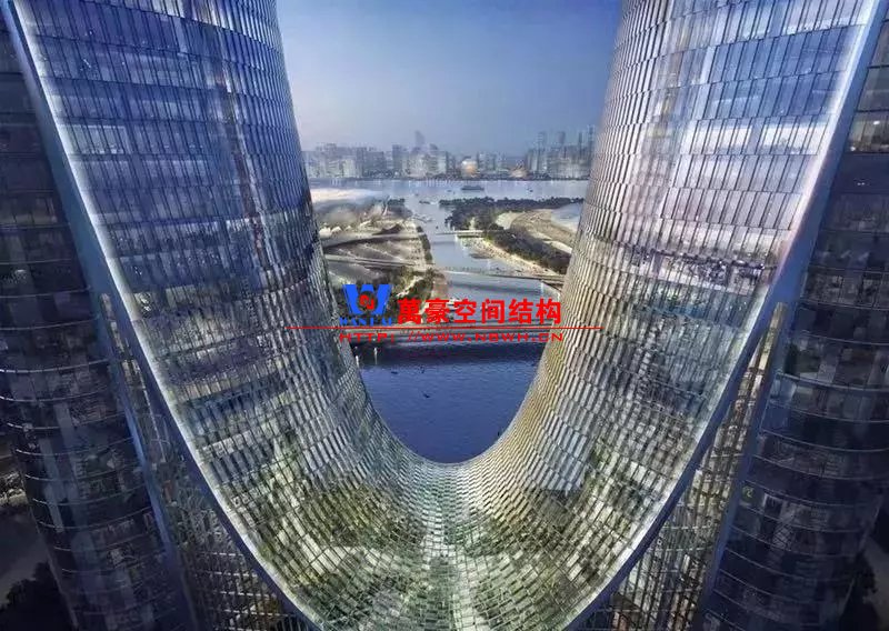 兩棟塔樓之間的底部跨度約60米,中間由約22米的鋼結(jié)構(gòu)拱連橋相接。