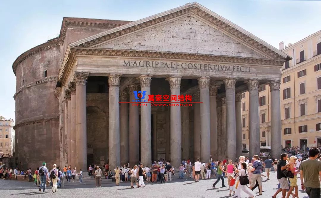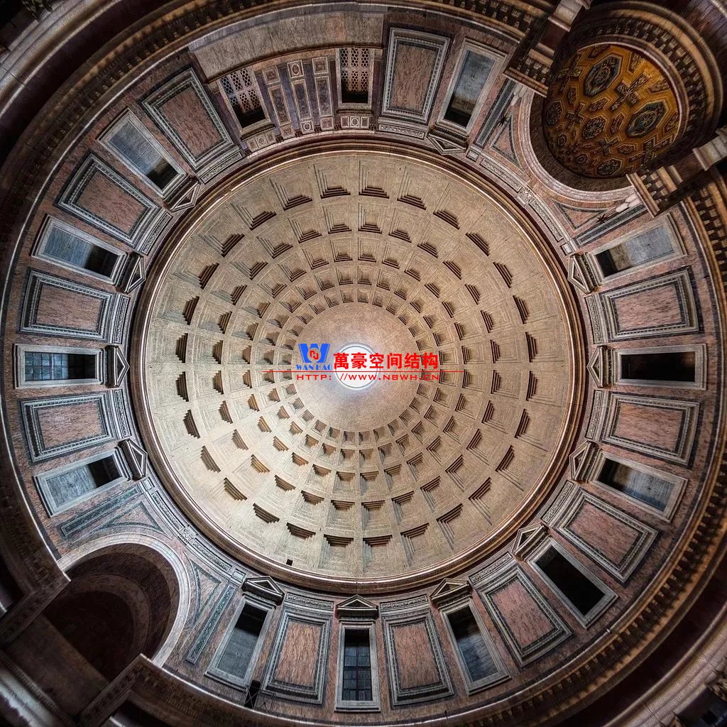 萬(wàn)神殿穹頂直徑43.3米,最高點(diǎn)也是43.3米,中部采光洞口直徑8.9米。穹頂采用古老的混凝土,其材料特性與石塊類似,抗壓王者抗拉弱雞。而穹頂結(jié)構(gòu)以受壓為主,建筑材料與結(jié)構(gòu)體系可謂天作之合。