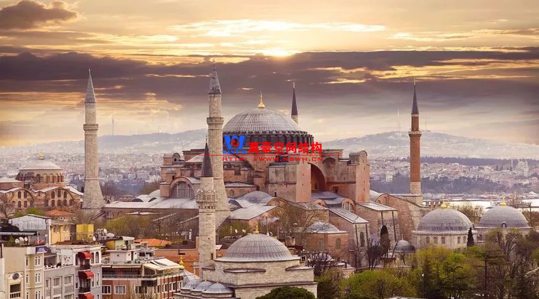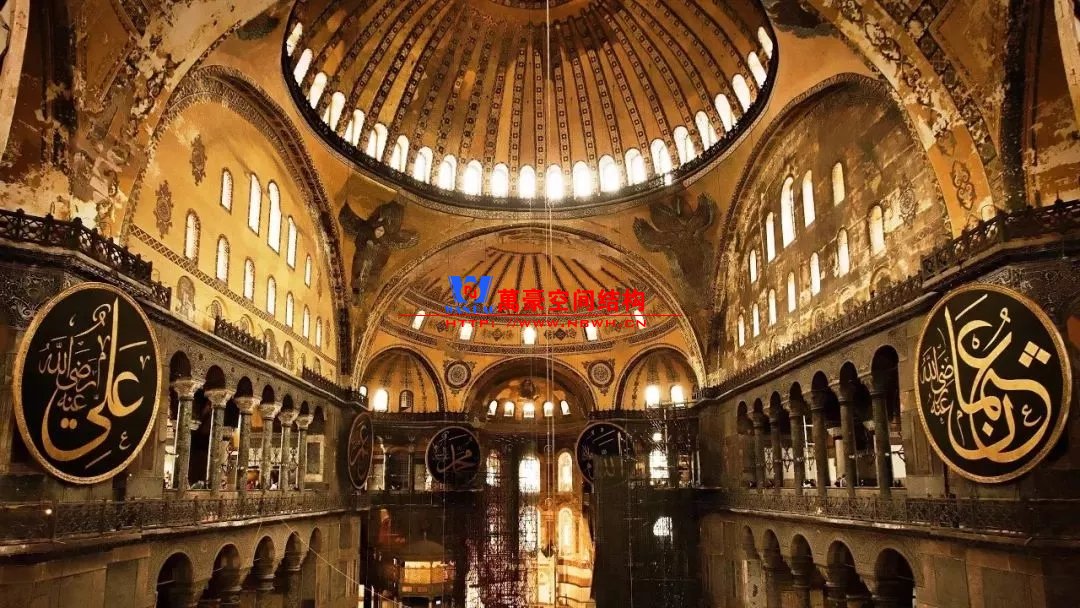 一千五百年前的圣索菲亞大教堂也因其巨大的穹頂而聞名于世。穹頂直徑31.24米。這座著名的穹頂也算是命運(yùn)多舛,自建成之后由于穹頂自身巨大的側(cè)推力曾先后倒塌三次。工程師也曾試圖通過(guò)增加墻厚、增設(shè)飛扶壁、增加穹頂矢高等方法加固,但依然沒(méi)有結(jié)束它不斷倒塌的命運(yùn)。