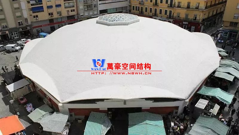再比如托羅哈1933年在瑞士設(shè)計(jì)的阿赫西拉斯鎮(zhèn)集市屋面。正八角形穹頂直徑達(dá)47.6m,曲率半徑為44.2m。作為單一的球殼,它的跨度第一次超越了萬(wàn)神廟穹頂。殼體厚度最小為8.9cm,厚跨比是1/535;支承點(diǎn)附近加厚至45.7cm。
