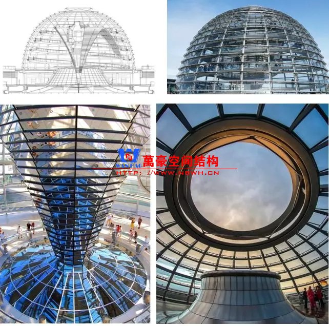 德國(guó)國(guó)會(huì)大廈改造中的穹頂即采用了肋環(huán)式網(wǎng)殼,中庭中部還有一螺旋式通道一直引領(lǐng)人們到達(dá)圓頂和瞭望平臺(tái)。相對(duì)于混凝土網(wǎng)殼,鋼與玻璃的組合通透性更好,同時(shí)也更符合密斯對(duì)于現(xiàn)代建筑的定義和現(xiàn)代人的審美標(biāo)準(zhǔn)。
