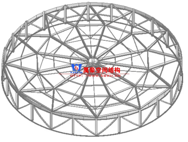 木質(zhì)拱架是穹頂最主要的受力構(gòu)件,共有36榀,呈放射狀布置。拱架以受壓為主。穹頂中心為鋼質(zhì)的承壓環(huán);底部是木質(zhì)空間桁架形式的拉環(huán),使得穹頂成為自平衡的體系,減小對(duì)柱子和基礎(chǔ)的推力。同時(shí)采用鋼拉桿以張弦的形式加強(qiáng)球殼面外抗彎剛度。外表覆蓋以白色膜材,在兩個(gè)骨架之間(折面波谷處)用穩(wěn)定索把薄膜向下壓緊,形成V字形狀,可以使積雪自然滑落。