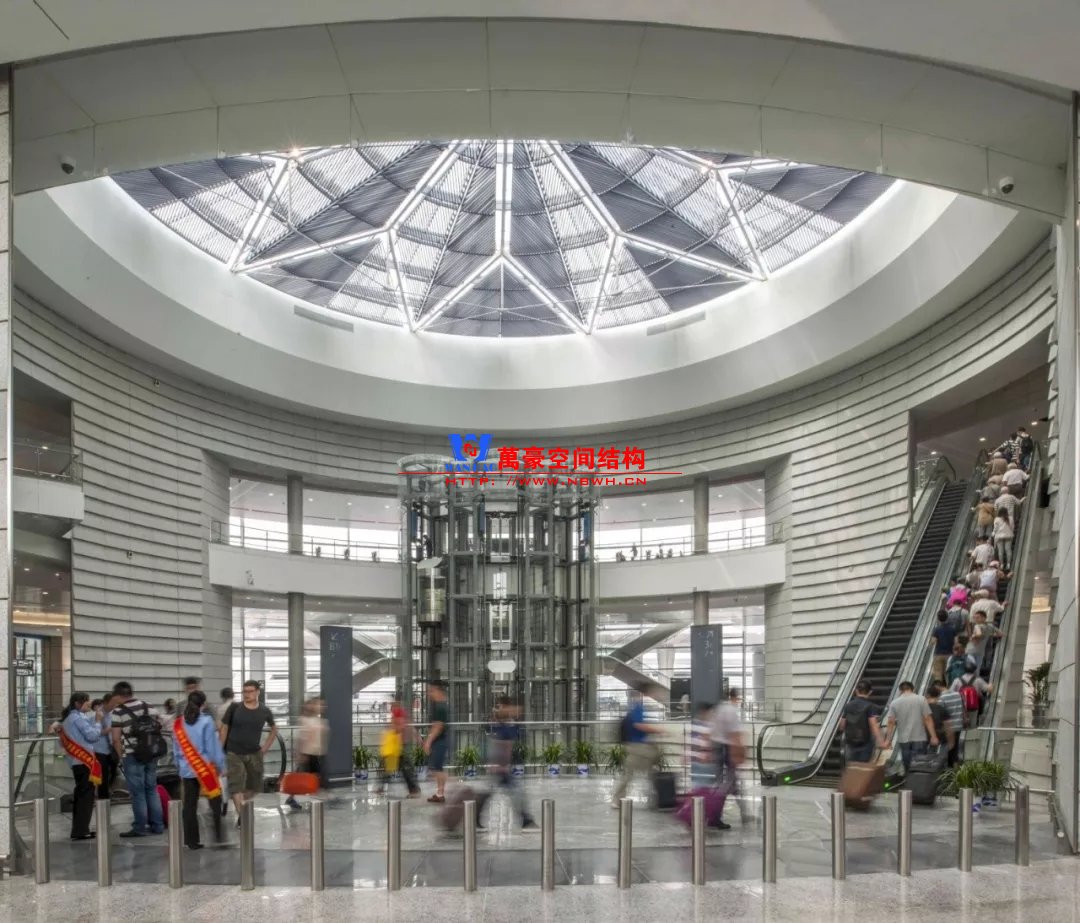 這是某機(jī)場(chǎng)交通中心中庭的一個(gè)圓形天窗,天窗直徑30米。如果讓我們隨便設(shè)計(jì),有哪些方法可以填滿這個(gè)圈呢,我們來(lái)看下。