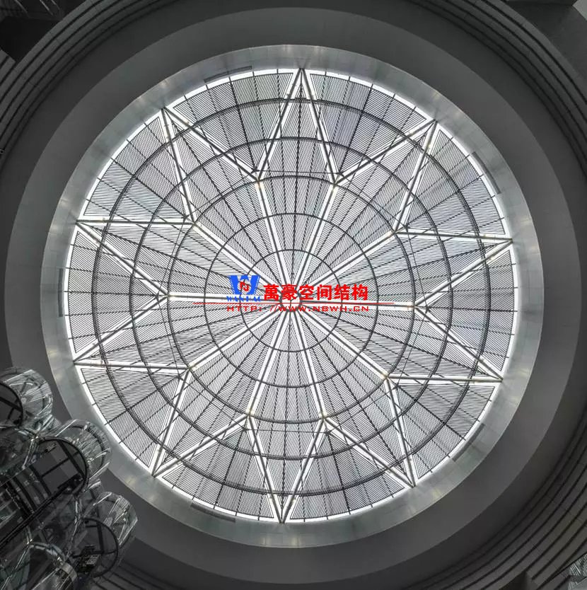 天窗位于交通中心地下一層圓形中庭上空,人流在這里交匯,在選擇結(jié)構(gòu)網(wǎng)格布置時(shí)需要考慮其向心匯聚效應(yīng),因此方向性較弱的施威德勒網(wǎng)格和凱威特網(wǎng)格就不適合。