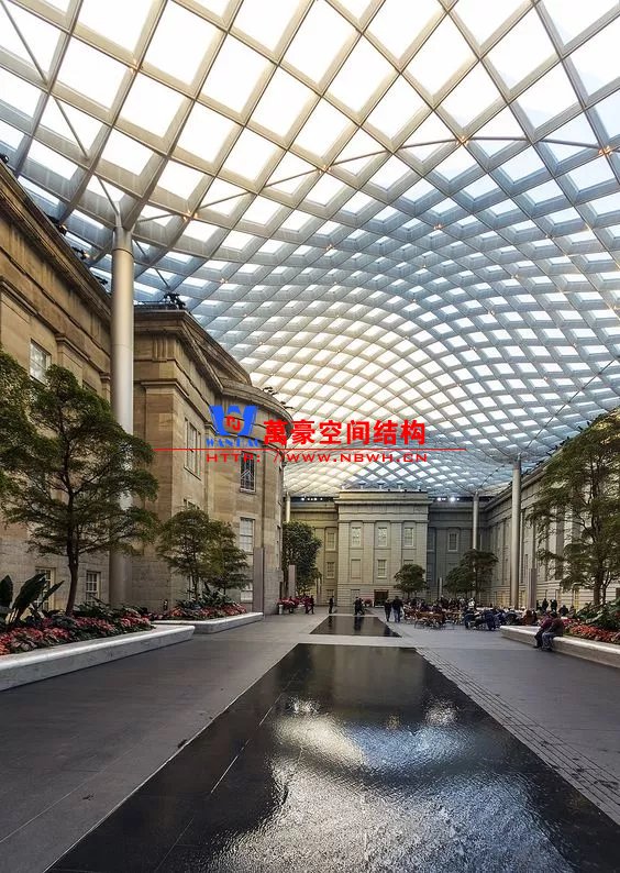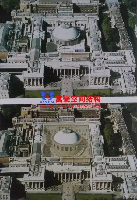 這個(gè)經(jīng)典的改造項(xiàng)目把輕與重巧妙組合。鋼結(jié)構(gòu)網(wǎng)殼內(nèi)側(cè)支承于圓形閱覽室,外側(cè)支承于方形博物館建筑的內(nèi)墻,通過(guò)找形分析得到一個(gè)拱起的規(guī)則形態(tài)。