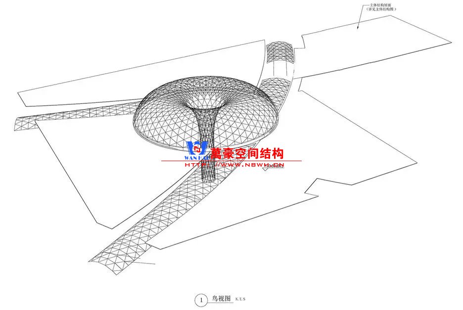 沿中心圓徑向布置主受力網(wǎng)格,再輔助另兩個(gè)方向的圓弧線條劃分出1656個(gè)三角形平面玻璃板。
