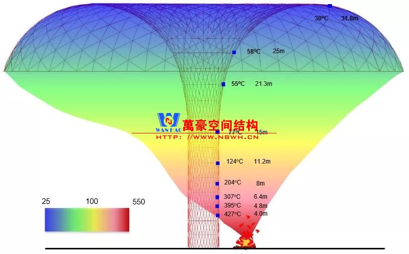 根據(jù)消防規(guī)范,中庭鋼結(jié)構(gòu)要涂防火涂層以提供1.5~3小時(shí)的耐火保護(hù)。通過(guò)性能化分析,設(shè)計(jì)師提出創(chuàng)新的水簾保護(hù)系統(tǒng)作為鋼材防火替代方案。水簾經(jīng)由氣化,可以吸收火與煙霧大部分熱量,使鋼材表面溫度顯著降低。