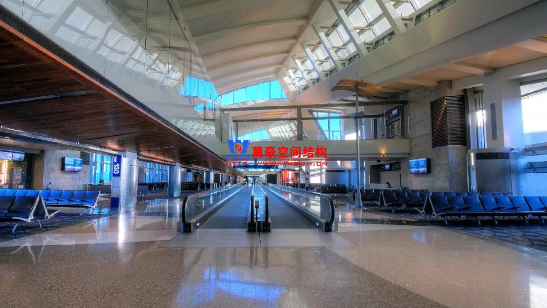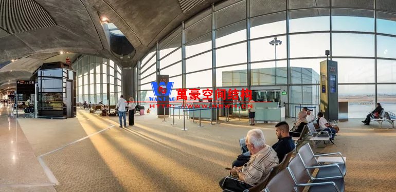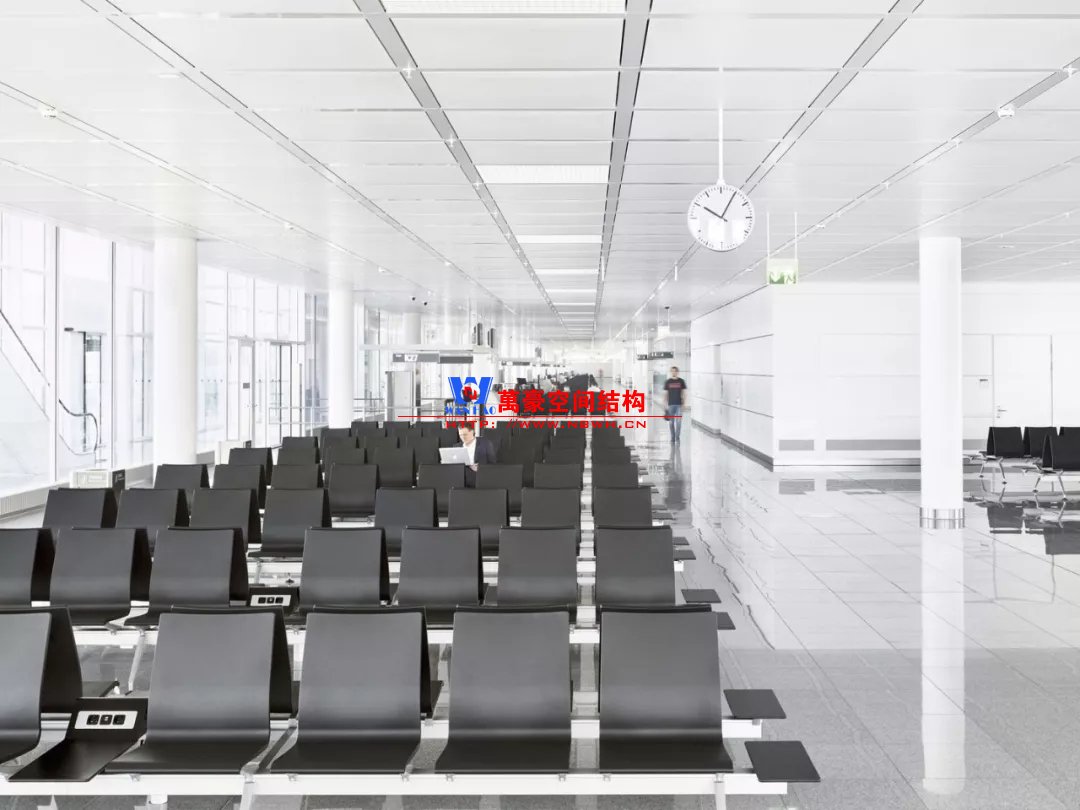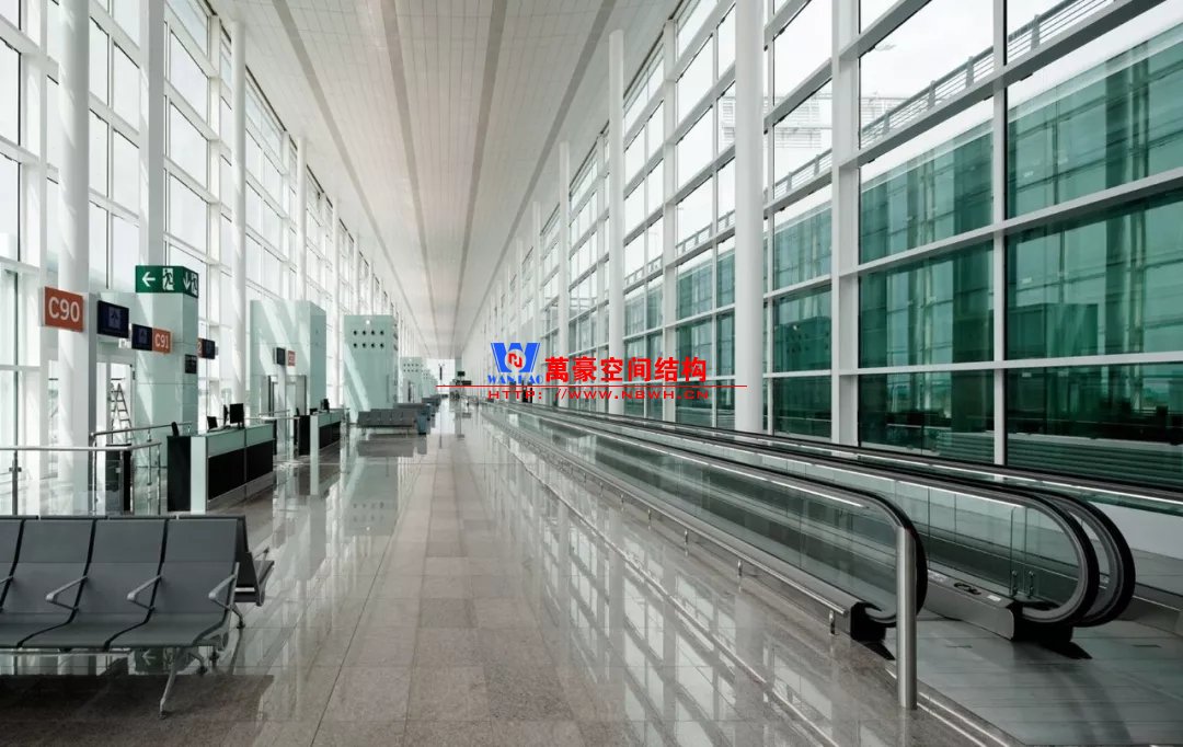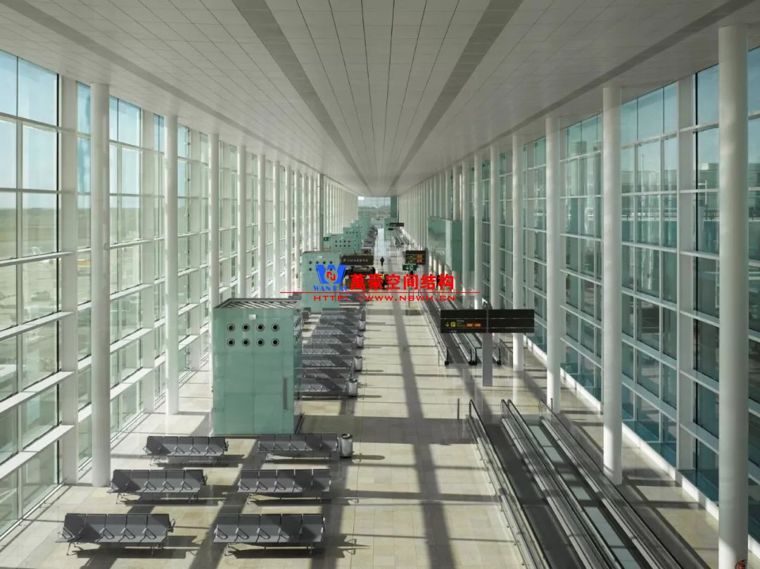 如巴塞羅那機場的指廊就是采用簡單的鋼框架結(jié)構(gòu)體系,鋼柱布置于兩邊;幕墻采用剛性幕墻,貼近鋼柱外側(cè)布置;室內(nèi)吊頂無天窗,吊頂走向沿長向,空間上有指向性。