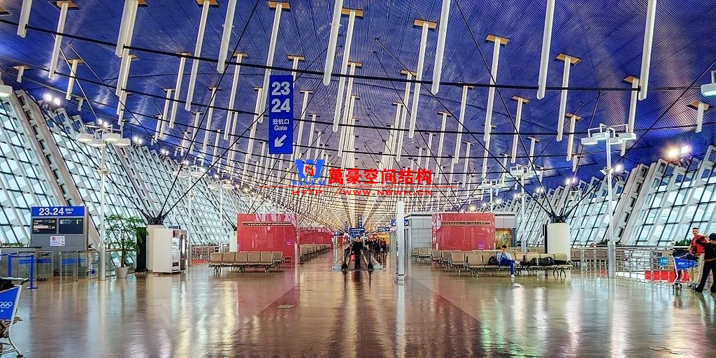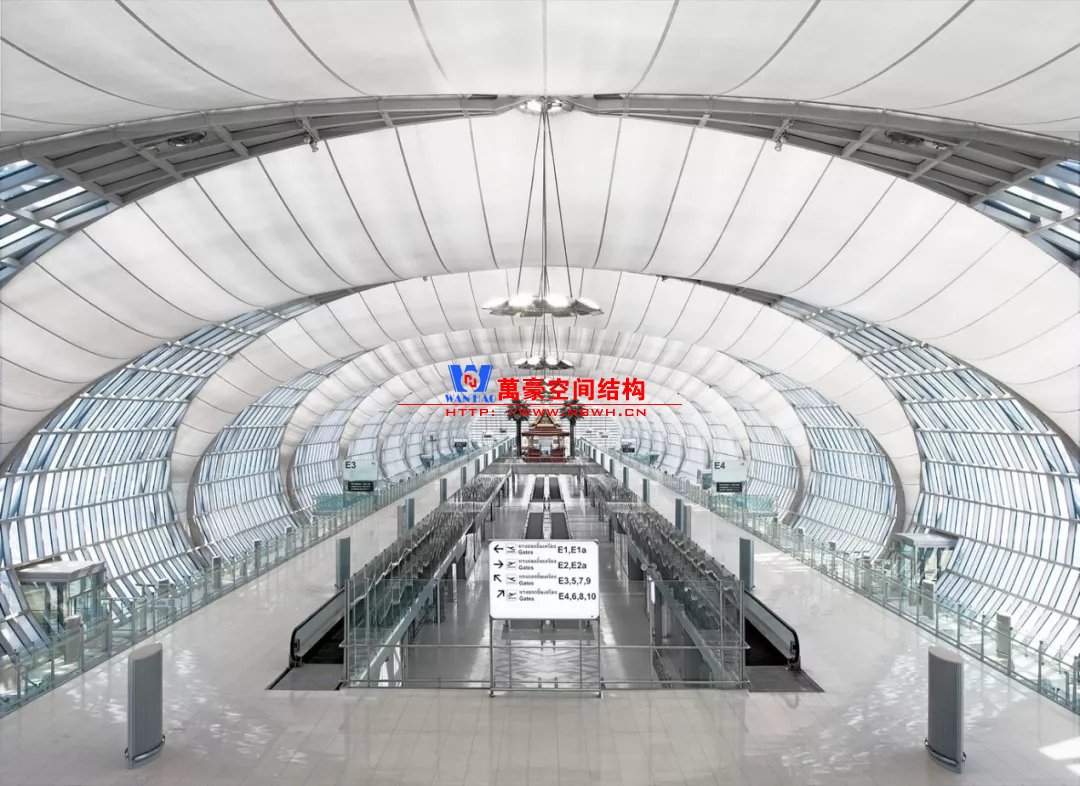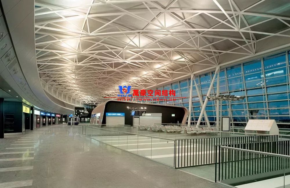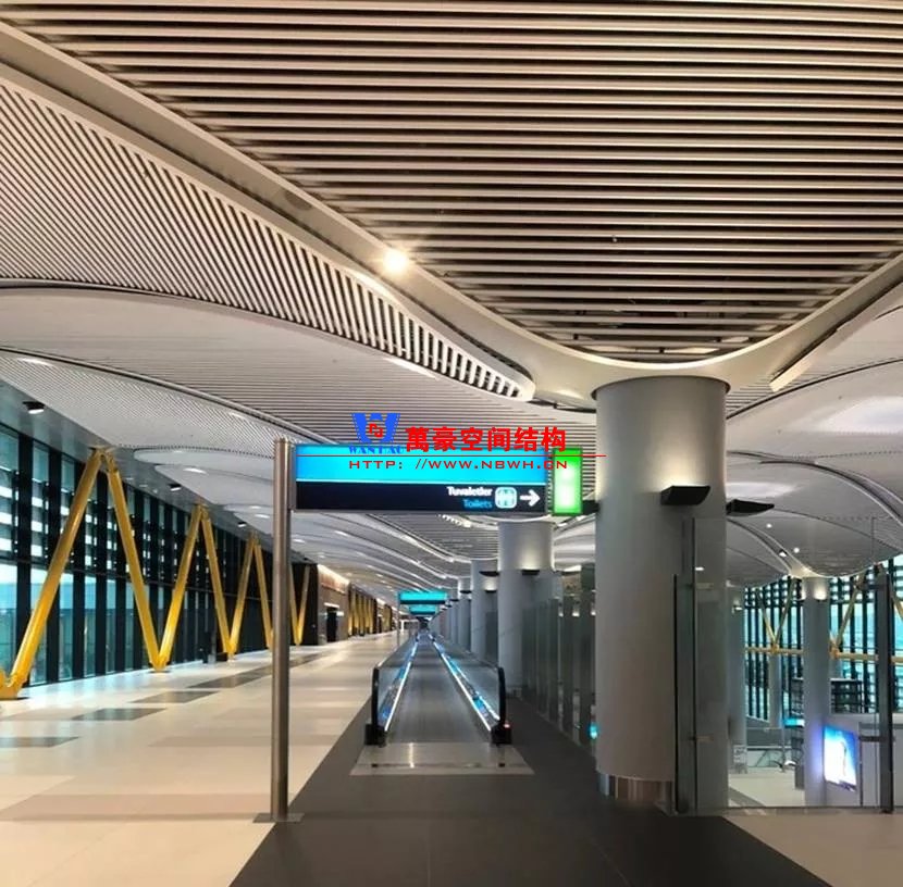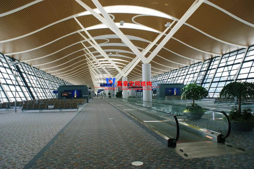 如巴塞羅那機場的指廊就是采用簡單的鋼框架結(jié)構(gòu)體系,鋼柱布置于兩邊;幕墻采用剛性幕墻,貼近鋼柱外側(cè)布置;室內(nèi)吊頂無天窗,吊頂走向沿長向,空間上有指向性。