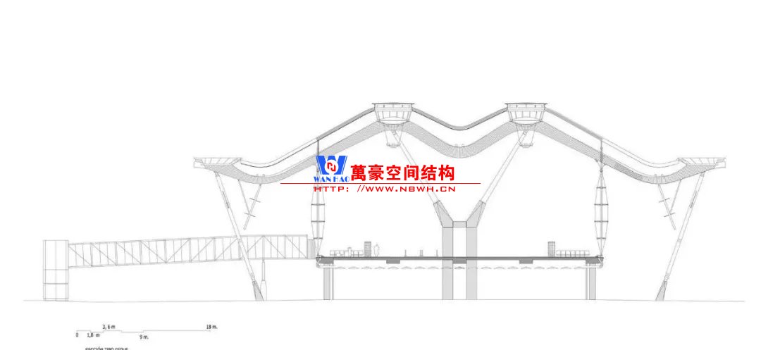 我們還可以讓平頂有些起伏變化來增加室內(nèi)效果,比如經(jīng)典的馬德里機場。指廊的剖面采用M形,為了應(yīng)對曲梁帶來的不利影響,工程師在中部布置了兩組Y形柱支撐于轉(zhuǎn)折點。