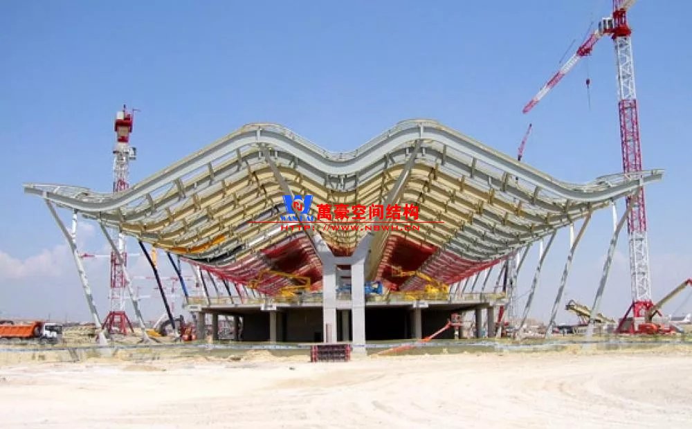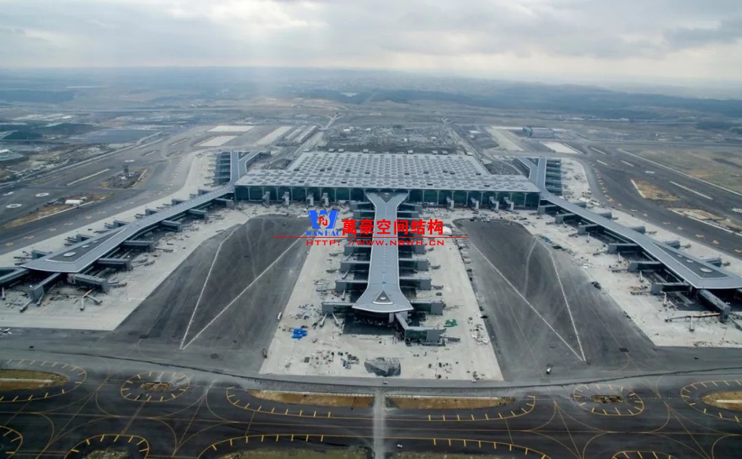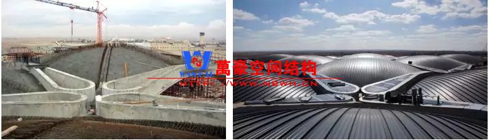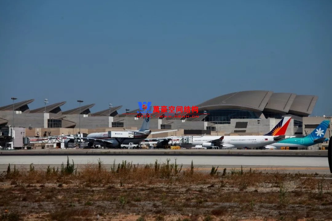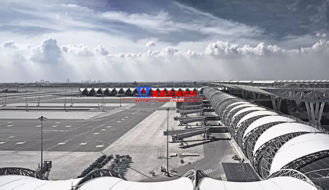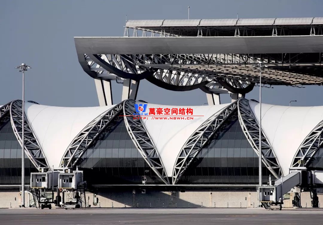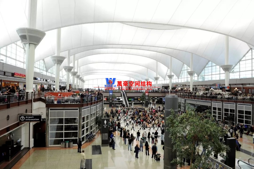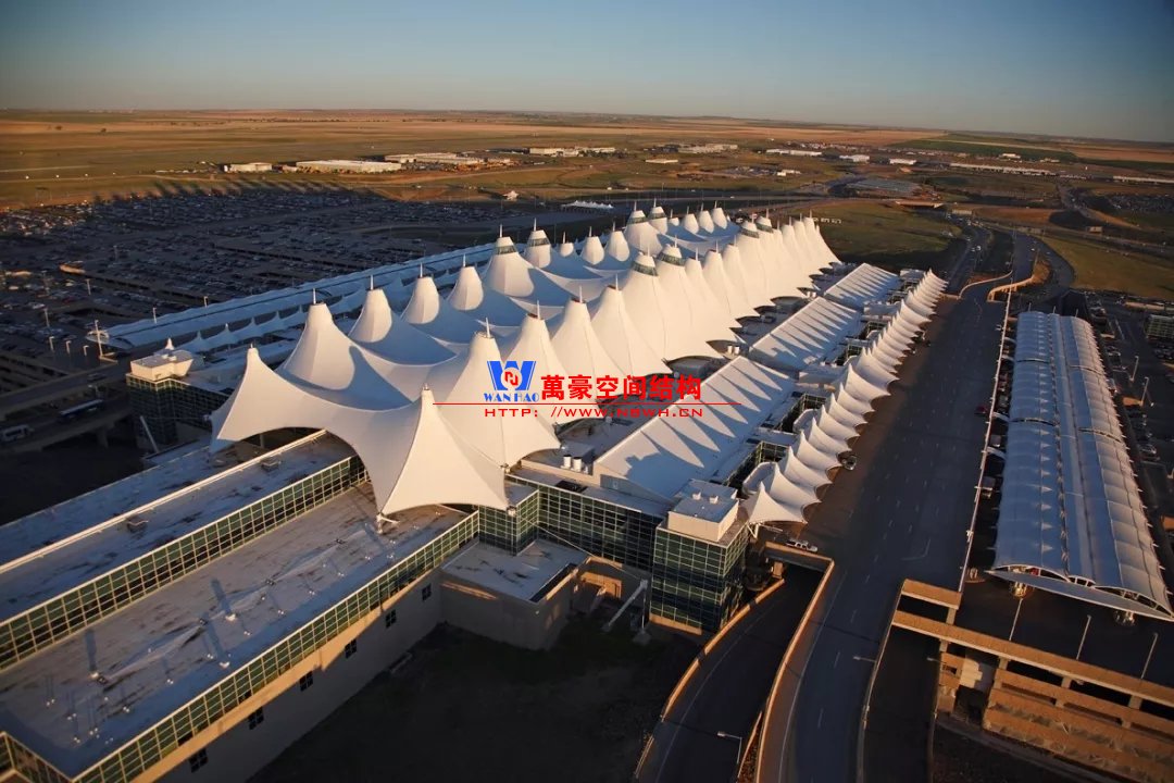 除了以上相對比較常見的結(jié)構(gòu)類型,還有一些是不太常見的樣式,且基本上只此一例別無他家。如丹佛機場則采用了膜結(jié)構(gòu),潔白的膜層層疊疊與遠處的雪山交相呼應(yīng),建筑效果很特別。那為何很少有機場大范圍采用膜結(jié)構(gòu)呢?可能和膜結(jié)構(gòu)的熱工性能和使用年限有關(guān)系,夏熱冬冷不節(jié)能。同時膜結(jié)構(gòu)對形態(tài)的適應(yīng)性比較差,需要特定的建筑樣式才能遷就膜結(jié)構(gòu),而不像鋼結(jié)構(gòu)基本能適應(yīng)任何建筑造型。因此建筑師如果想選擇膜結(jié)構(gòu),需要和結(jié)構(gòu)工程師在早期有更多的溝通。