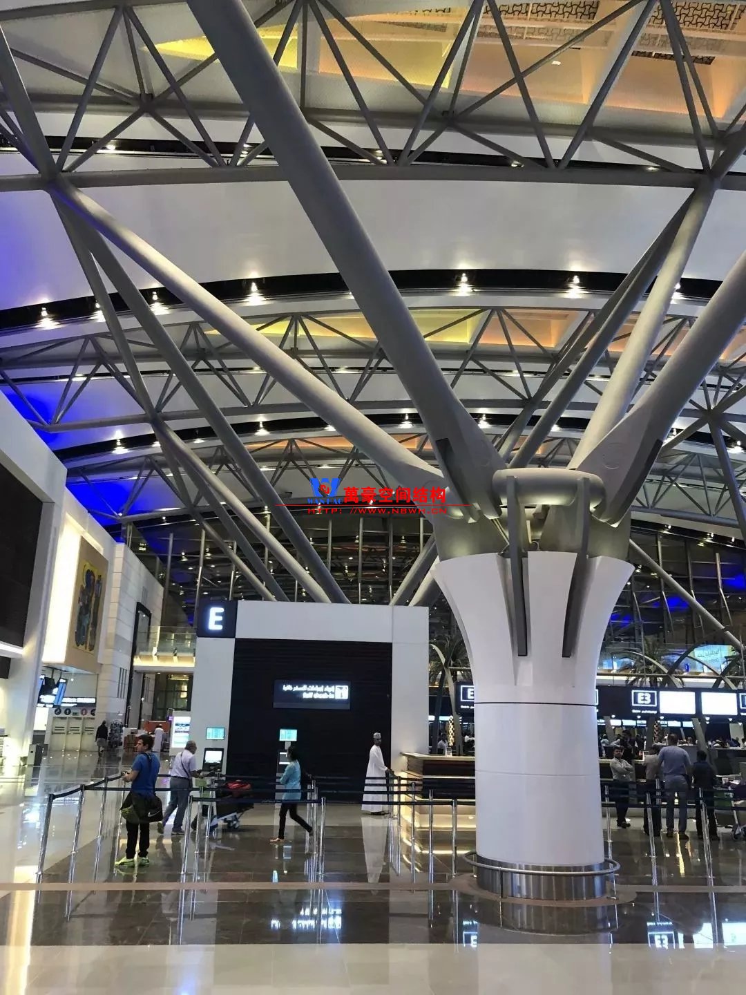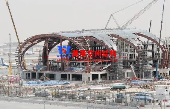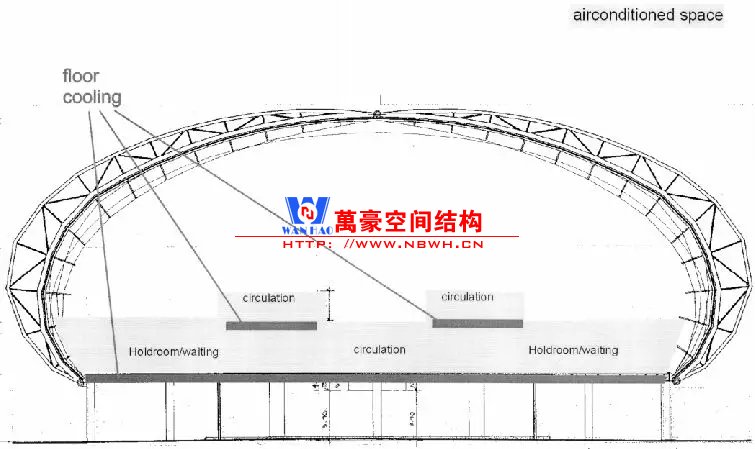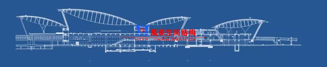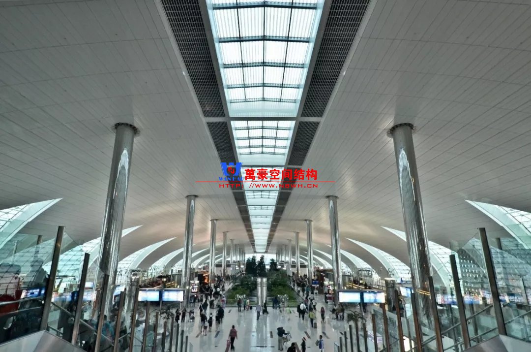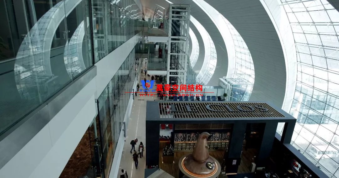 無獨有偶迪拜機場也是采用相似的外形,但是由于剖面并不是一個完整的拱形,因此構(gòu)件內(nèi)彎矩作用會比較明顯,因此在室內(nèi)布置了兩根柱子。立面幕墻則采用索桁架半剛性幕墻立面更加通透。與雙流機場不同,結(jié)構(gòu)構(gòu)件是吊頂外包的,因此外包區(qū)域采用了效率更高的主次梁體系。
