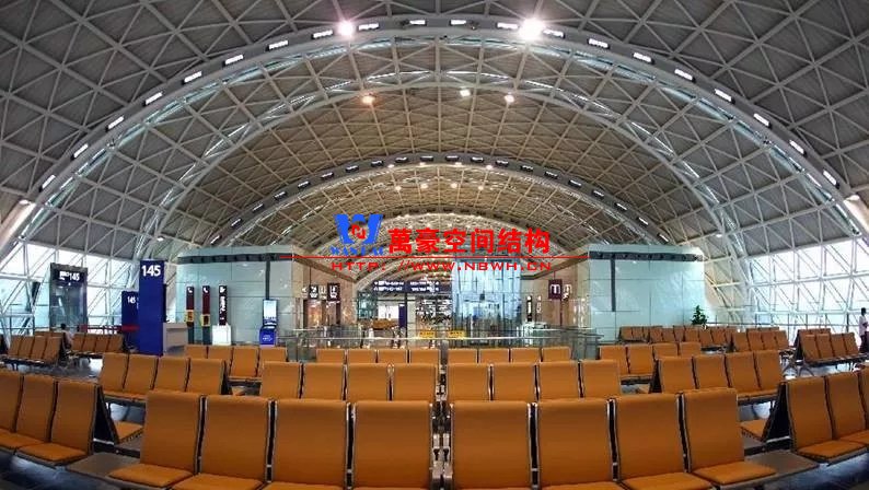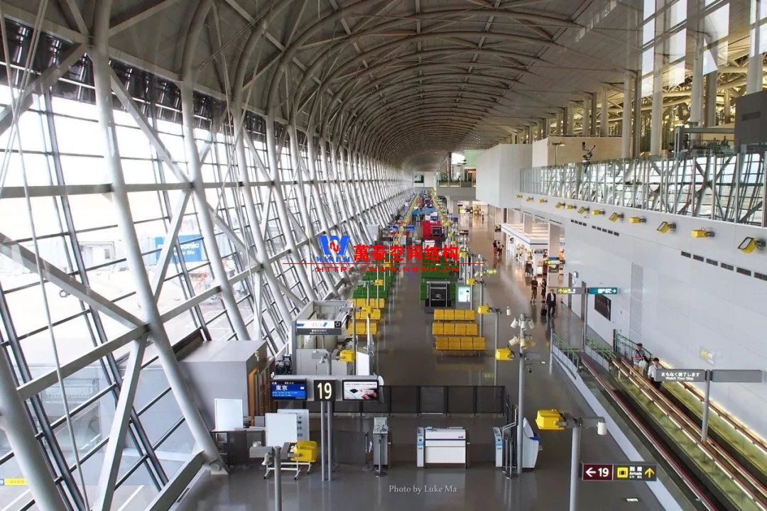 大阪關(guān)西機場則采用弧形鋼梁+索的結(jié)構(gòu)體系,有效減小了鋼梁尺寸,同時由于沒有天窗光線作用,鋼索并不明顯??赡苁怯捎谌毡臼堑卣鸲喟l(fā)地區(qū),外露的支撐構(gòu)件比較多略顯雜亂。