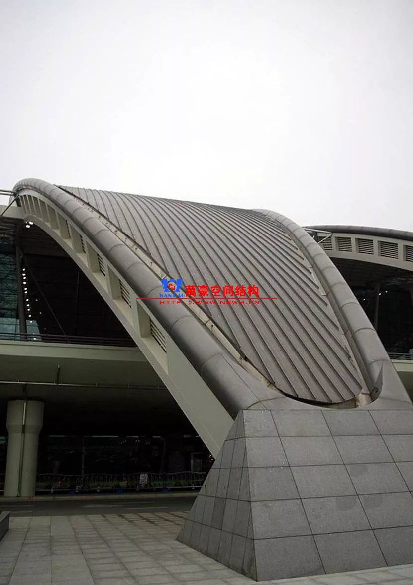 浦東國際機場T2航站樓將結(jié)構(gòu)梁在立面彎曲的同時,平面也形成弧線將天窗融合進去,室內(nèi)效果也很好。同時對節(jié)點也進行了精細化設(shè)計,細節(jié)處體現(xiàn)了建筑結(jié)構(gòu)融合設(shè)計的思想。