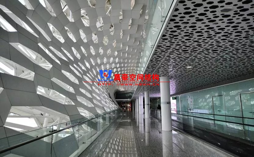 當(dāng)然也可以用萬能的桁架和網(wǎng)架去擬合筒形的曲面,但建筑的不同處理方法,會讓最終效果呈現(xiàn)出完全不同的感覺。如深圳寶安機場采用桁架+網(wǎng)架的結(jié)構(gòu)體系貼合建筑的上下表皮,最終建筑做吊頂外包,建筑吊頂采用鏤空的形式表達出建筑紋理,但在縫隙中可以看到結(jié)構(gòu)構(gòu)件。