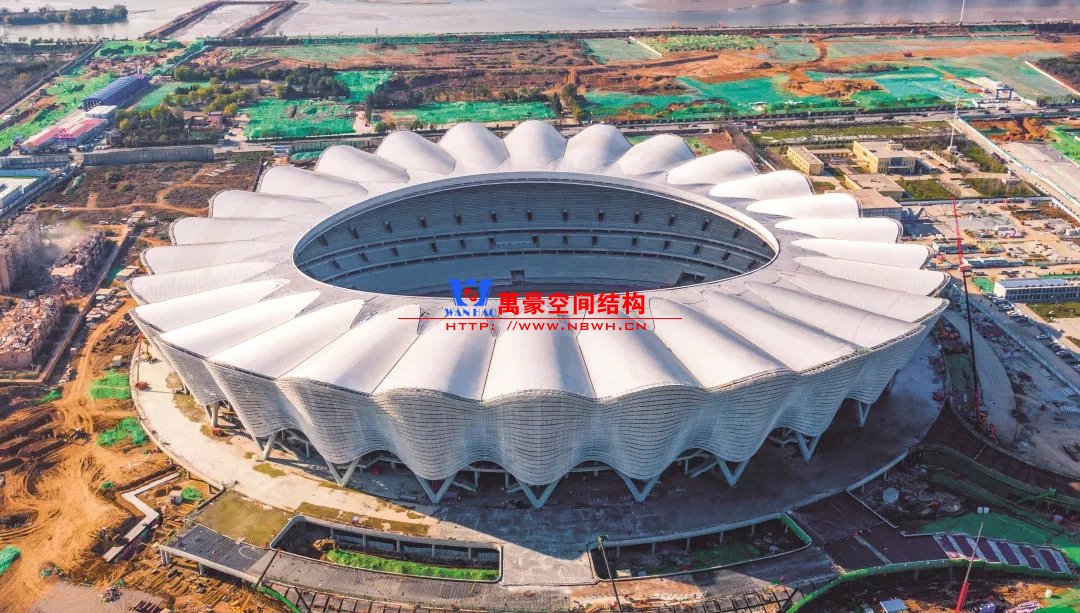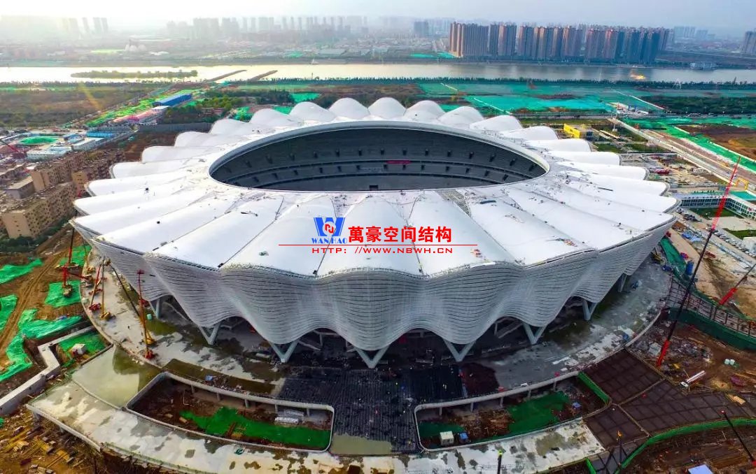 體育場(chǎng)主體建筑為南北長(zhǎng)332m、東西寬316m的橢圓形,鋼結(jié)構(gòu)罩棚最高處高58.3m,最低處高42.6m;中間開(kāi)口南北長(zhǎng)200m、東西寬153m。主體鋼結(jié)構(gòu)采用空間懸挑鋼桁架結(jié)構(gòu),由28個(gè)V形柱支撐72片鋼結(jié)構(gòu)管桁架,整體東西高,南北低,呈馬鞍形,體育場(chǎng)看臺(tái)為框架-剪力墻體系。屋頂圍護(hù)結(jié)構(gòu)為鋁鎂錳直立鎖邊金屬屋面,罩棚立面采用銀白色穿孔鋁板幕墻系統(tǒng),通過(guò)有韻律的變化,表達(dá)了絲綢飄舞的動(dòng)感,輕盈通透的罩棚在夜晚能夠透出賽場(chǎng)內(nèi)熱烈的賽事氣氛,宛如皓月長(zhǎng)空下綻放的盛世之花。碗型看臺(tái)分為上、中、下三層座席,并在中上層看臺(tái)之間設(shè)置包廂層(包括66個(gè)大小包廂)及其座席區(qū),觀眾分別由各層看臺(tái)對(duì)應(yīng)的通道進(jìn)入。