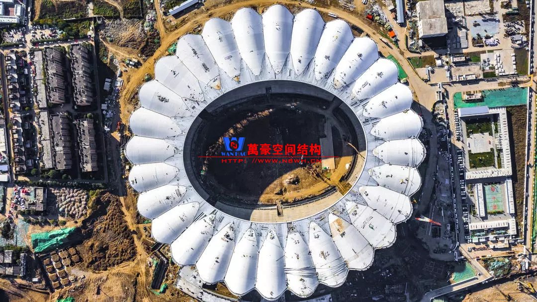 體育場(chǎng)罩棚鋁板幕墻由16464塊,近22000㎡不規(guī)則彎曲鋁板拼接而成,支撐系統(tǒng)由3528根雙曲鋼環(huán)梁和16464支T型連接件構(gòu)成,施工單位北京江河幕墻公司,全力拼搏,力保節(jié)點(diǎn),攻艱克難,采用全站儀進(jìn)行三維精確定位,共計(jì)49392個(gè)定位點(diǎn),10個(gè)拼裝班組歷時(shí)106天,現(xiàn)場(chǎng)完成3528榀組裝單元;吊裝班組耗時(shí)86天,高空打點(diǎn)定位共計(jì)3528個(gè),逾35臺(tái)登高車(其中58m登高車7臺(tái)),14臺(tái)汽車吊,累計(jì)完成3528吊,于11月30日實(shí)現(xiàn)外立面呈現(xiàn)。