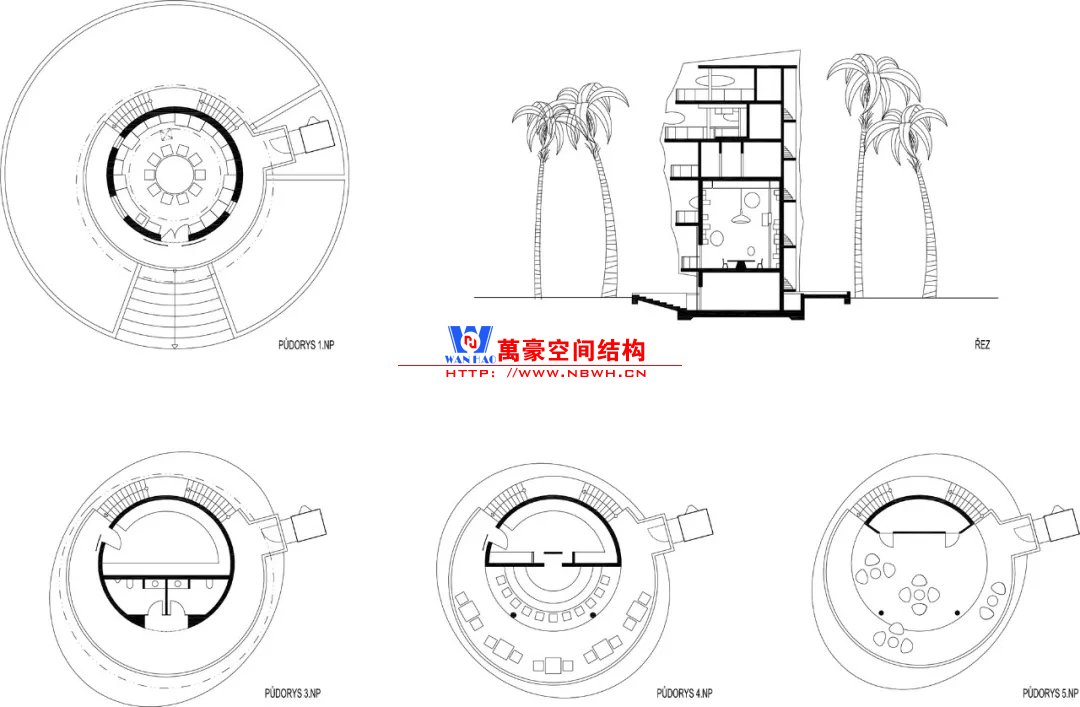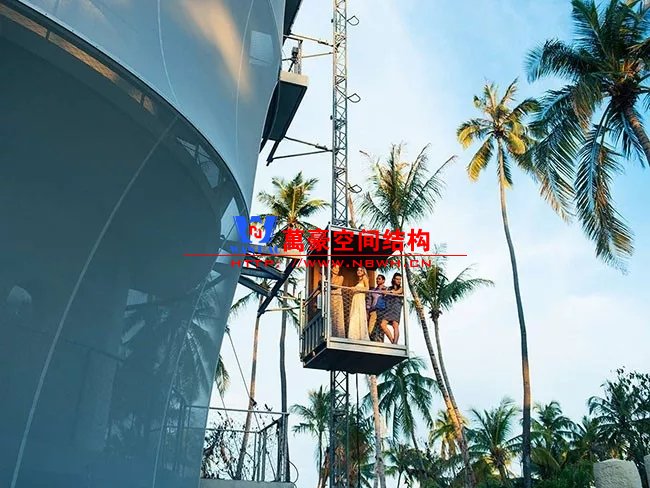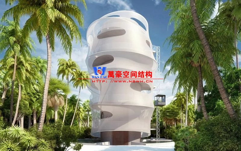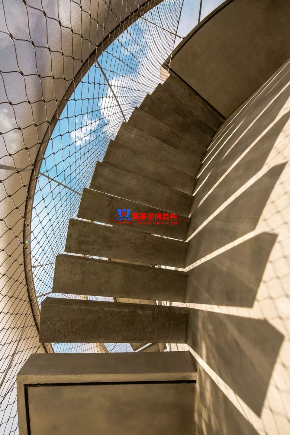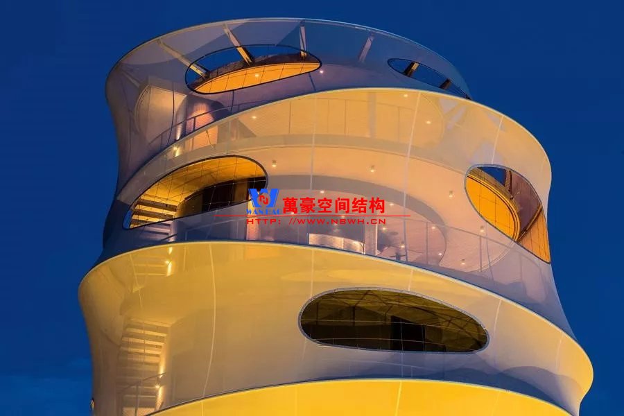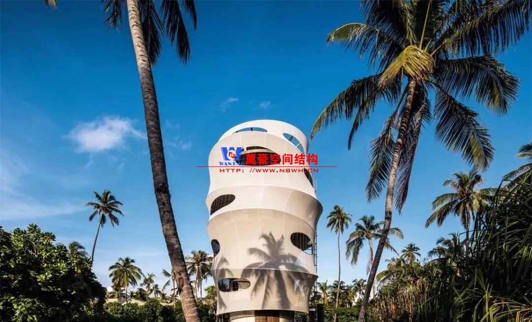 與島上其他傳統(tǒng)的“塔瓦魯”風(fēng)格建筑不同,由于其高度為23米,并且采用特殊結(jié)構(gòu),目前的結(jié)構(gòu)在島上占主導(dǎo)地位。建筑物的正面使用了鋼筋混凝土整體結(jié)構(gòu),而不是傳統(tǒng)的天然材料。它用作支撐管,由各個(gè)預(yù)制臺(tái)階制成的控制臺(tái)樓梯圍繞該支撐管旋轉(zhuǎn)。外圍的所有元素都被遮蓋在淺灰色半透明的法拉利381網(wǎng)孔膜中,遮陽(yáng)隔熱,又不影響視覺(jué)通透性。