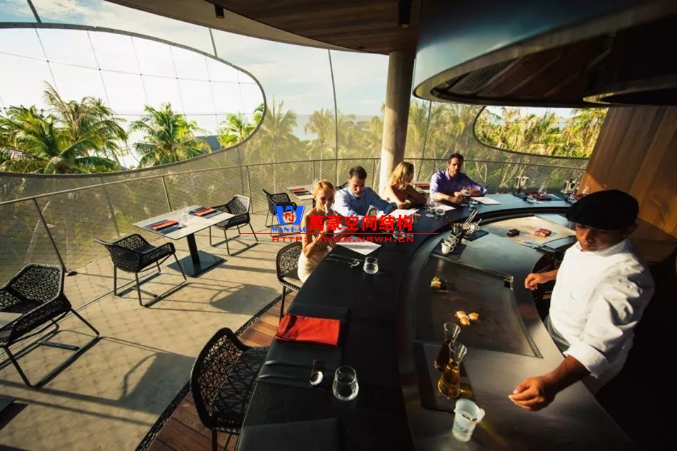 法拉利織物幕墻完美的微氣候調(diào)節(jié)系統(tǒng)適合窖藏世界上最優(yōu)質(zhì)的紅酒,此外還有口味絕佳的日本料理在此恭候游客的品嘗。酒窖占據(jù)了兩個(gè)較低的樓層。其余樓層用于餐廳設(shè)施和餐廳本身。最后一層設(shè)有一個(gè)休息室,可欣賞整個(gè)島嶼的景色-這是馬爾代夫所有地區(qū)唯一的全景視圖。