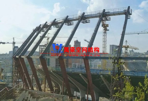 基輔國家奧林匹克體育場保留了大部分建于1968年的的原混凝土看臺結構,屋蓋結構則通過設置在看臺結構外圍的鋼結構立柱進行支撐,這樣避免了將屋蓋結構的自重和承受的外力直接作用到原混凝土結構及其下部基礎上去。