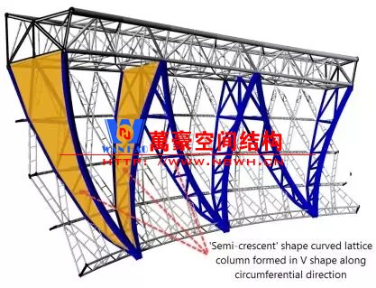 盧賽爾體育場外形就像一個碩大的“金缽”,其主體及看臺鋼結(jié)構(gòu)總用鋼量約3萬噸,相當于三個埃菲爾鐵塔的重量。V柱是項目主體鋼結(jié)構(gòu)的重要組成部分,總重量約為6271噸,是“金缽”主要的豎向傳力系統(tǒng),為壓環(huán)以及幕墻側(cè)壁結(jié)構(gòu)提供支承,并將豎向力傳遞到混凝土柱墩上,進而傳遞到地面。