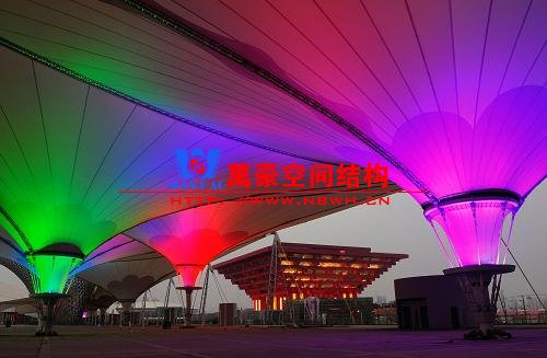 世博軸ptfe索膜結(jié)構(gòu)是迄今為止世界規(guī)模最大的連續(xù)張拉索膜結(jié)構(gòu),膜材選用了一種名為PTFE(聚四氟乙烯)的涂層玻璃纖維,具有不易燃性、防紫外線(xiàn)、抗風(fēng)化、自潔性、高反射性等特點(diǎn),完全可以適應(yīng)上海地區(qū)的臺(tái)風(fēng)氣候。陽(yáng)光谷ptfe索膜結(jié)構(gòu)只有在十級(jí)以上的風(fēng)力,才會(huì)出現(xiàn)明顯的位移,這個(gè)位移也在可以控制的范圍之內(nèi)。陽(yáng)光谷建筑負(fù)責(zé)人驕傲的告訴記者。上海世博會(huì)工程建設(shè)指揮部辦公室的市政項(xiàng)目部總經(jīng)理趙克平透露,張拉膜總面積約77224m2,最大跨度約97米,由31個(gè)外側(cè)桅桿,19個(gè)下拉點(diǎn)以及18個(gè)與陽(yáng)光谷的拉接點(diǎn)通過(guò)13種不同功能索張拉而成,膜片數(shù)量69片,其中最大的膜單片面積達(dá)1780m2。