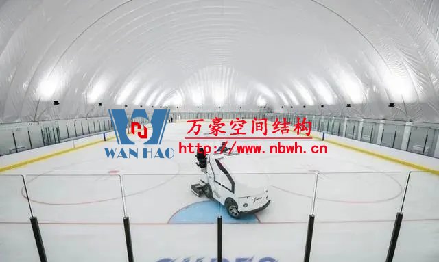 首都體育學院氣膜滑冰館,是首個模塊化裝配式的直冷冰場。位于海淀區(qū)北三環(huán)西路11號,總建筑面積7010平方米,為地上一層,局部二層的結(jié)構(gòu)?;^內(nèi)部分為南、北兩個場館,每個場館內(nèi)設(shè)有一個奧林匹克標準級冰球場,制冰總面積3600平方米。