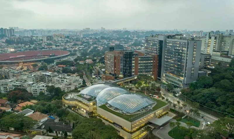作為拉丁美洲最先進(jìn)的醫(yī)學(xué)研究機構(gòu)之一,阿爾伯特·愛因斯坦醫(yī)學(xué)教育研究中心(Albert Einstein Education and Research Center, AEERC)坐落在巴西圣保羅莫倫比住宅區(qū),是巴西第一所由私立醫(yī)院建立的醫(yī)學(xué)院,被認(rèn)為該領(lǐng)域最重要的學(xué)習(xí)及研究機構(gòu)之一。3,800平方米的玻璃屋頂,由三個巨大的穹頂互相交疊而成,組成了一個網(wǎng)格化的殼體,以最輕的鋼結(jié)構(gòu)撐起了86米的巨殼。同時,多層玻璃的組合設(shè)計,兼具濾光、散熱和吸聲功能。天窗外層由1854塊高透明度玻璃板構(gòu)成,使用的玻璃材料反射率極小,可以避免反光影響。此外,玻璃板涂有三層銀面,能夠減少太陽輻射熱能,印在其上的半透明陶點還可用于遮陽。天窗內(nèi)層為透明的ETFE膜結(jié)構(gòu),其上設(shè)有微型孔洞用于吸收噪音,并印有定制的半透明圓點以輔助遮陽。天窗的穹頂中央幾近透明,而靠近東西兩端圓點密度逐漸增大,使得充足的自然光可以照向中央花園茂盛的植物,而東西方向的低角度陽光則被有效遮蔽。同時,這些圓點在自然光下形成獨特的光線效果——從下方看,層層疊疊的點狀圖案仿佛斑駁的樹影,營造出在巨樹下沐浴陽光的獨特感受。薩夫迪建筑事務(wù)所聯(lián)合了國際景觀、環(huán)境和園藝團(tuán)隊,在植物選擇、土壤混合、容器設(shè)計、灌溉、維護(hù)和環(huán)境控制系統(tǒng)等多個方面進(jìn)行了為期兩年的深入研究,并借鑒了新加坡的濱海灣花園(Gardens by the Bay)、星耀樟宜機場(Jewel Changi Airport),以及英國的邱園(Kew Gardens)、伊甸園(Eden project)等項目的成功經(jīng)驗。