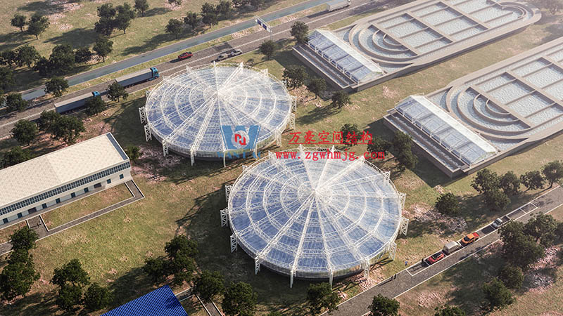 案例:寧波萬豪空間結(jié)構(gòu)工程有限公司承建的格爾木污水處理池保溫加蓋工程,榮獲中國鋼結(jié)構(gòu)協(xié)會2022年度“科學(xué)技術(shù)創(chuàng)新獎”獎項,該項目由直徑60米和直徑30米的不等池子組合完成,采用軟玻璃ETFE膜材料作為基材,具有高透光率、自重輕盈、柔軟可張拉、抗震效果好等特點(diǎn),完美達(dá)到污水處理池對陽光和紫外線照射的要求,屬于國內(nèi)首例ETFE在工業(yè)污水保溫加蓋中應(yīng)用工程。萬豪秉承“顧客至上,安全生產(chǎn),質(zhì)量第一”的理念安全施工,獲得了廣大客戶的良好口碑!未來也會繼續(xù)努力,在膜結(jié)構(gòu)領(lǐng)域大跨步向前,獲得更多榮譽(yù)和表彰,也為中國膜結(jié)構(gòu)事業(yè)增光添彩。