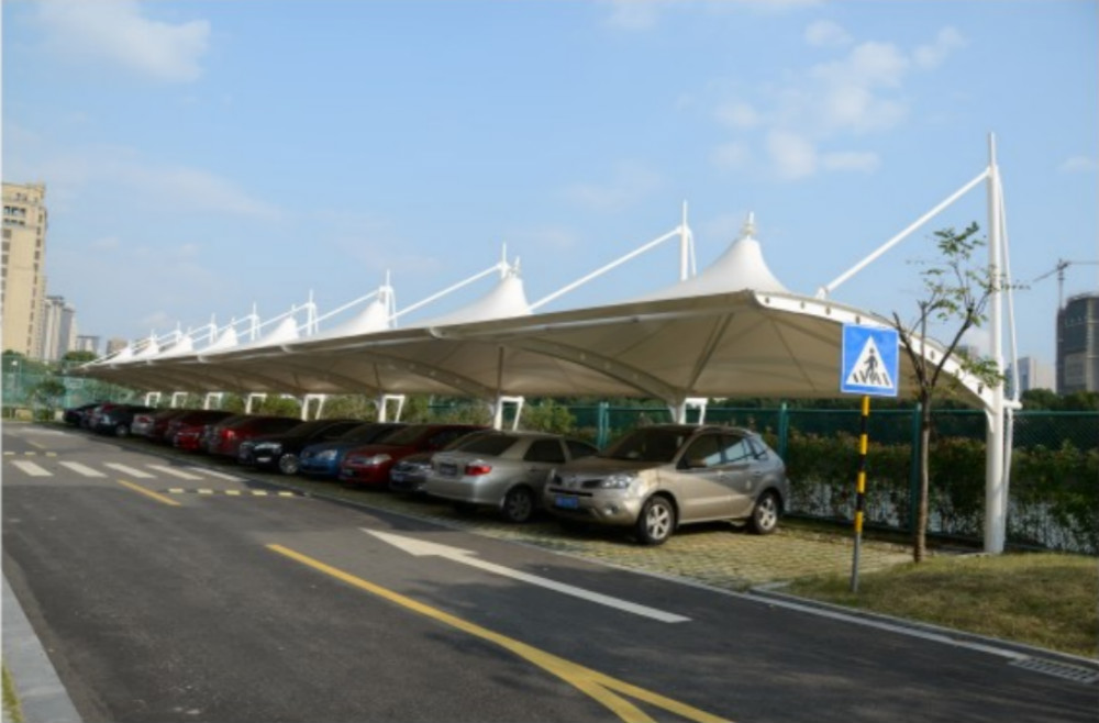 第二點,膜結(jié)構(gòu)停車棚頂部封板采用茶色(顏色可挑選)陽光板封頂,與車棚整體骨架用壓條鉚接固定,耐酸堿腐蝕,有足夠強度對棚內(nèi)車輛起到保護作用;