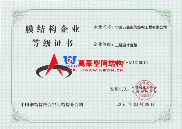 • 膜結(jié)構(gòu)工程總承包特級(設(shè)計、制作、安裝)資質(zhì),鋼結(jié)構(gòu)工程二級資質(zhì)
