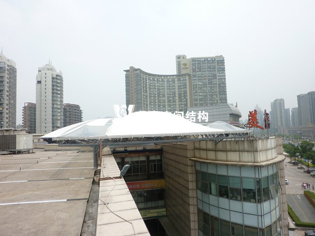 穹頂采用ETFE透明膜作為點綴,既解決了采光問題又增添了觀賞性,穹頂中心用直徑12鋼索解決了結構的穩(wěn)定性,大大提高了地面空間的利用率??朔伺f建筑物大跨度無立柱施工的難題,讓購物的市民享有整潔的休憩空間,成為了蕭山城市的輪廓線。