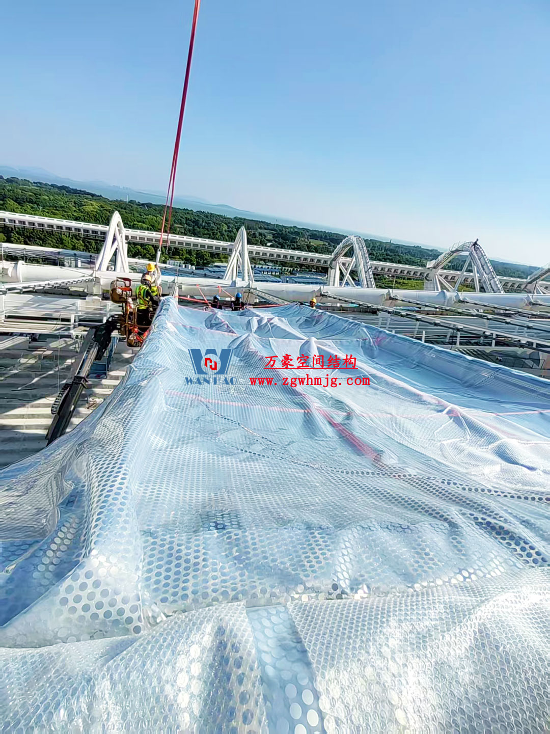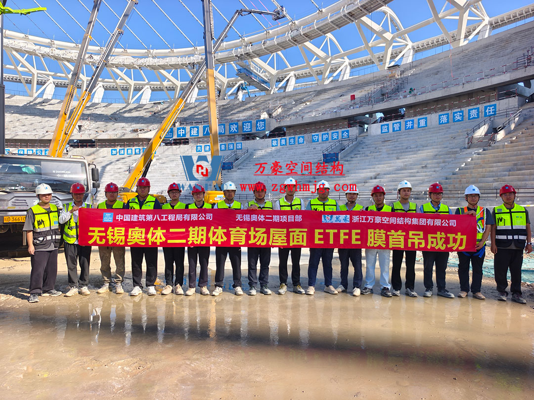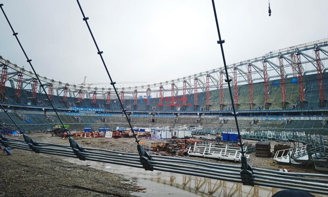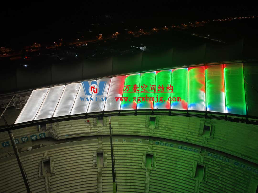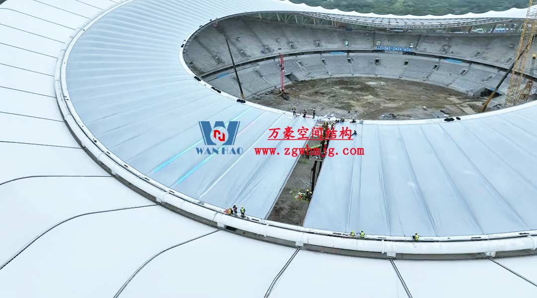 該項(xiàng)目采用車輻式索膜結(jié)構(gòu)體系,其中膜結(jié)構(gòu)由屋面內(nèi)環(huán)ETFE氣枕結(jié)構(gòu)、屋面外環(huán)PTFE膜結(jié)構(gòu)及立面PTFE膜結(jié)構(gòu)組成。 其中,屋面ETFE氣枕由萬豪空間結(jié)構(gòu)深化設(shè)計(jì)及安裝,ETFE氣枕投影面積20000平方米左右。