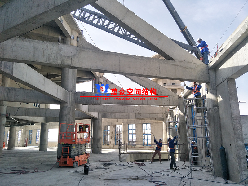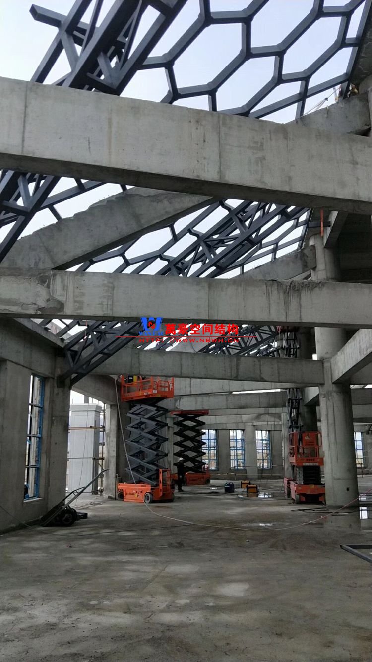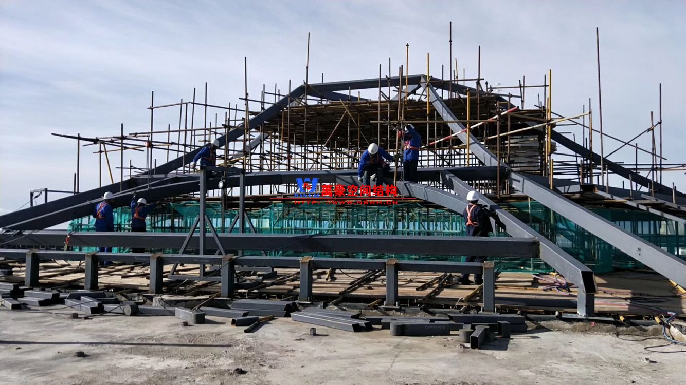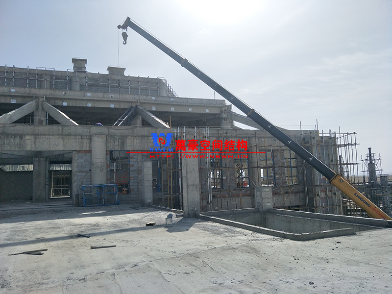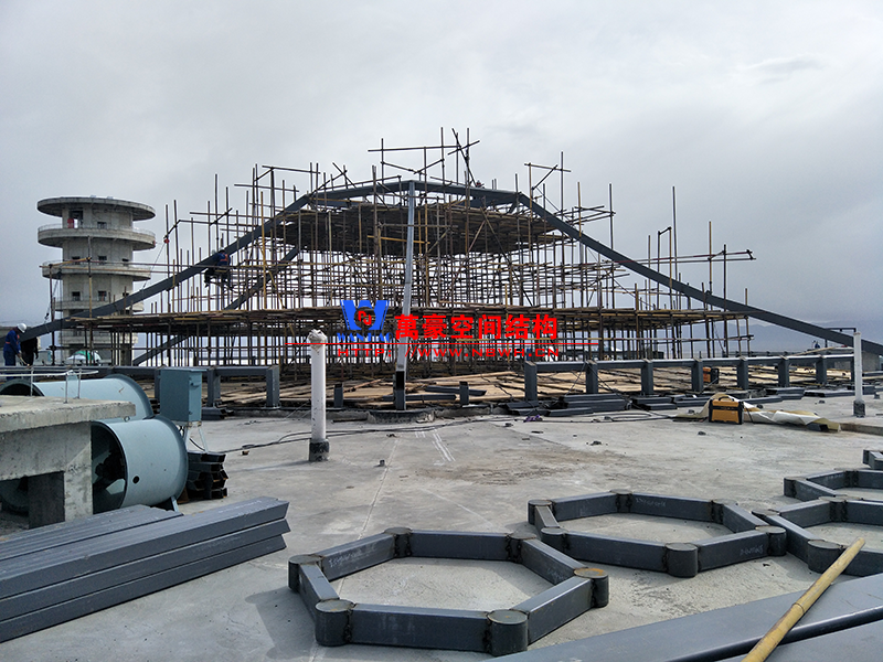 目前,主樓六邊形、二樓斜屋面每面四根大梁已全部安裝完畢,現(xiàn)在一個面的其他鋼構(gòu)正在安裝中,穹頂大梁框架完成。