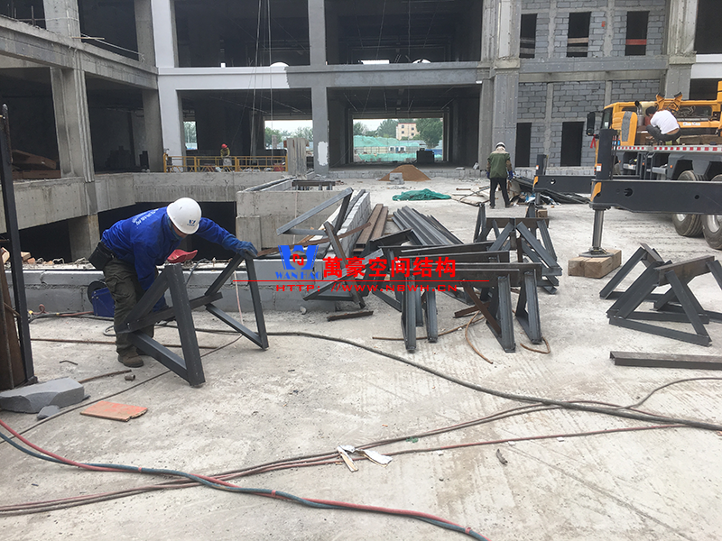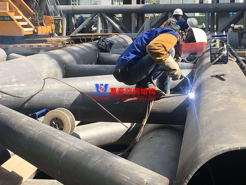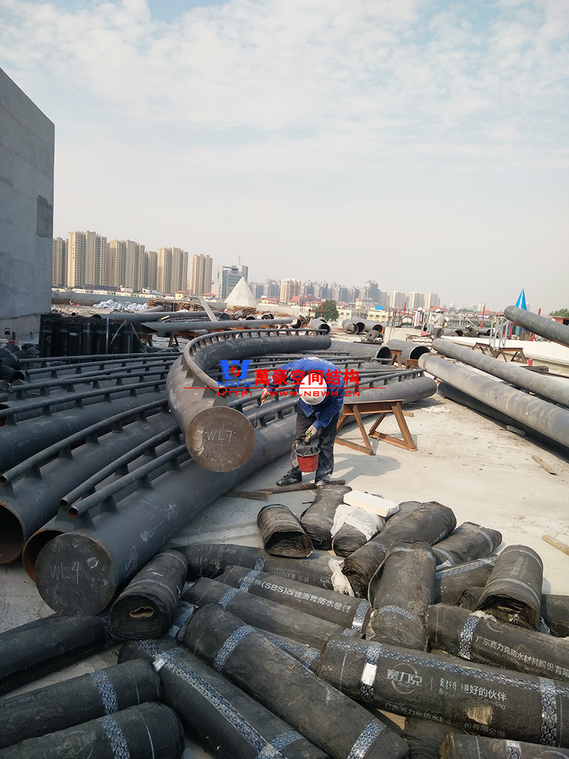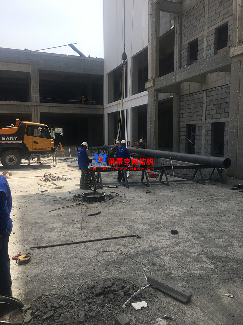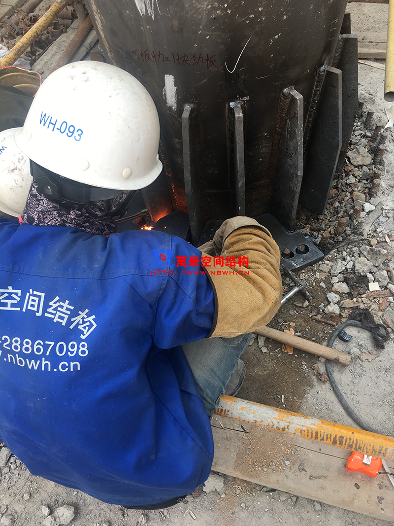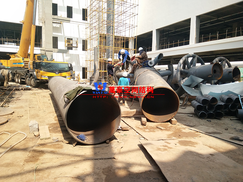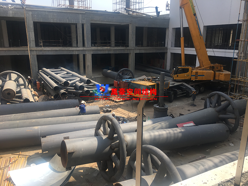 目前一號云朵鋼柱立起3根,懸挑管架全部拼裝完畢,桁架拼裝完成;二號云朵鋼柱立起3根,桁架、漏斗已基本到位,懸挑構件焊接中;三號云朵鋼柱焊接中,隔板、環(huán)板正在有序拼裝。