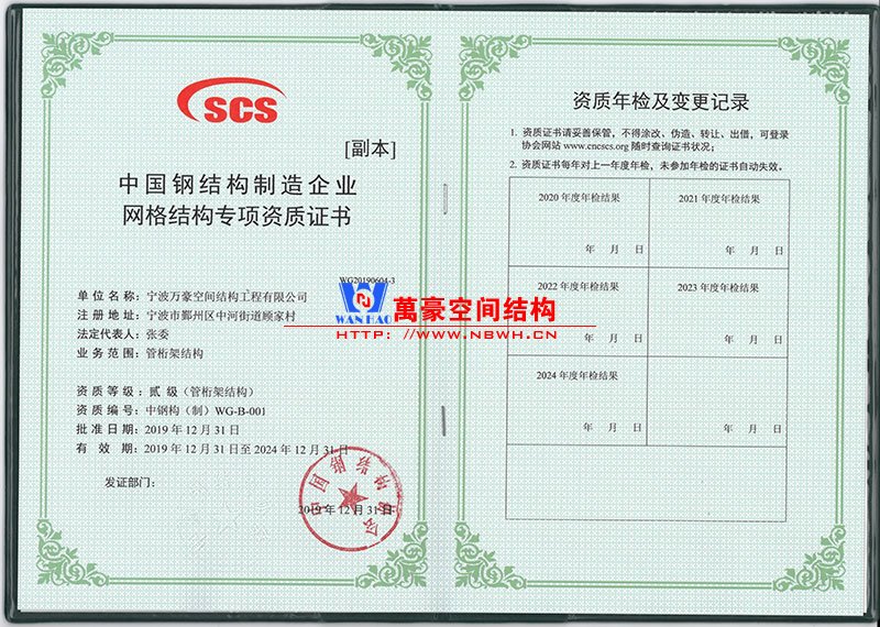 喜訊!喜訊! 萬(wàn)豪膜結(jié)構(gòu)獲得中國(guó)鋼結(jié)構(gòu)制造企業(yè)網(wǎng)格結(jié)構(gòu)專項(xiàng)資質(zhì)證書。