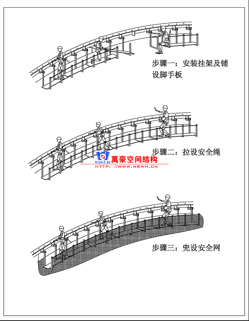 本工程主體結(jié)構(gòu)高,致使膜結(jié)構(gòu)的安裝不得不在高空進(jìn)行,同時(shí)針對(duì)現(xiàn)場(chǎng)作業(yè)條件我司考慮使用懸掛腳手架的方案。焊接式掛架利用端部的掛鉤直接懸掛在鋼結(jié)構(gòu)連接板的位置。焊接式掛架現(xiàn)場(chǎng)安裝時(shí)必須保證掛架與地面垂直,掛架內(nèi)、外兩側(cè)各設(shè)安全防護(hù)繩, 每隔五個(gè)掛架拉一對(duì)防晃纖繩與二次部材筋板拉結(jié),防止擺動(dòng)。