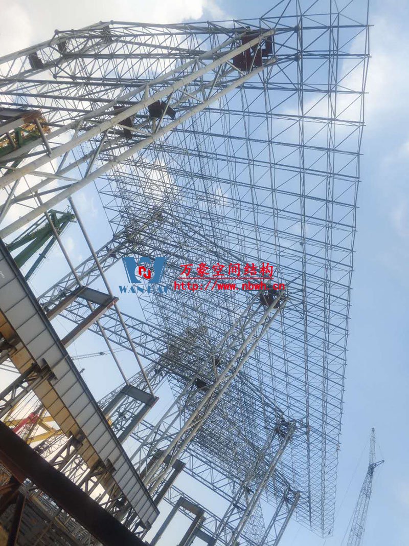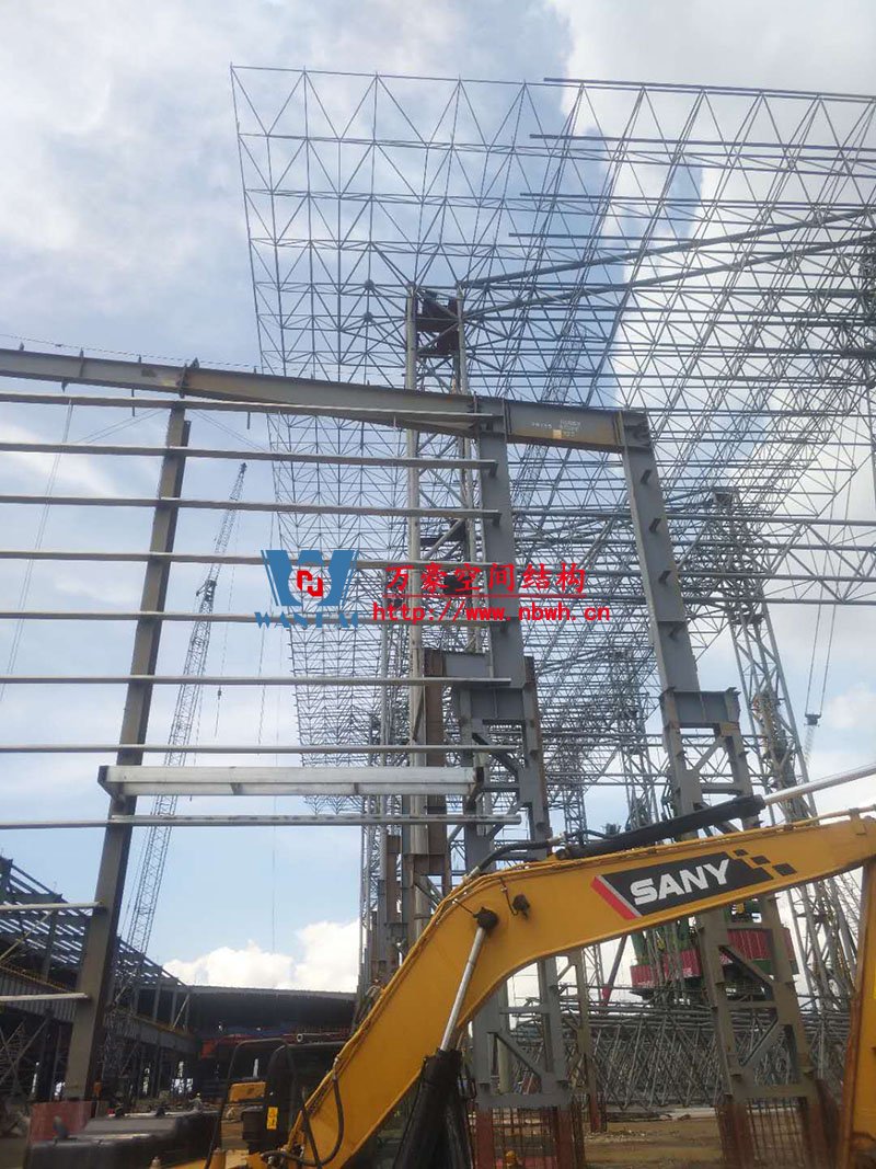 印尼全天候碼頭倉庫屋面膜結構工程高度55米,跨度160米,采用鋼結構地面整體拼裝,分區(qū)域整體起吊的安裝方式,鋼用量總共2000噸,膜結構展開面積30000平米,屋面膜結構工程由寧波萬豪空間結構有限公司承建。